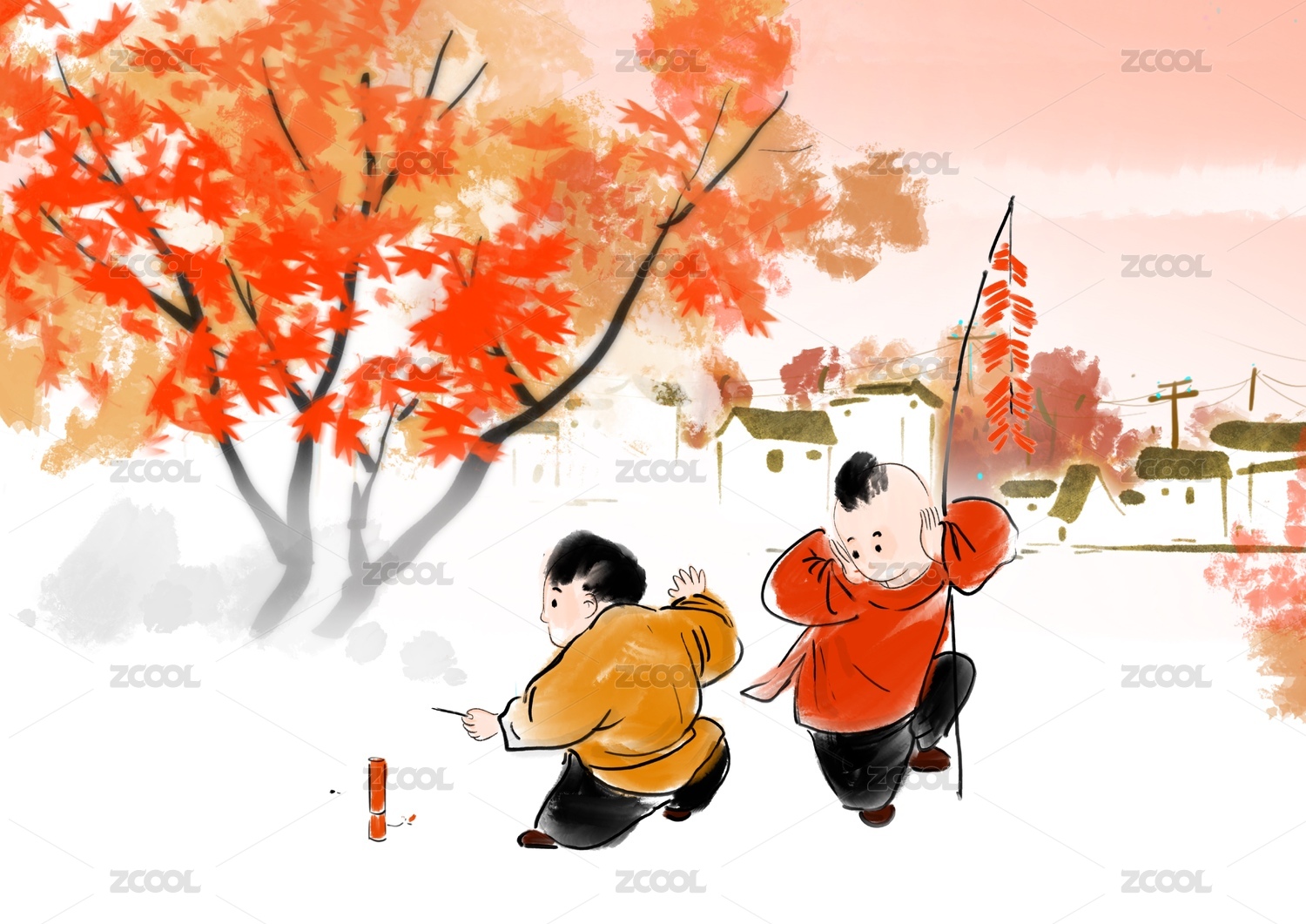 冬季春節(jié)江南鄉(xiāng)村水墨風(fēng)景畫過年