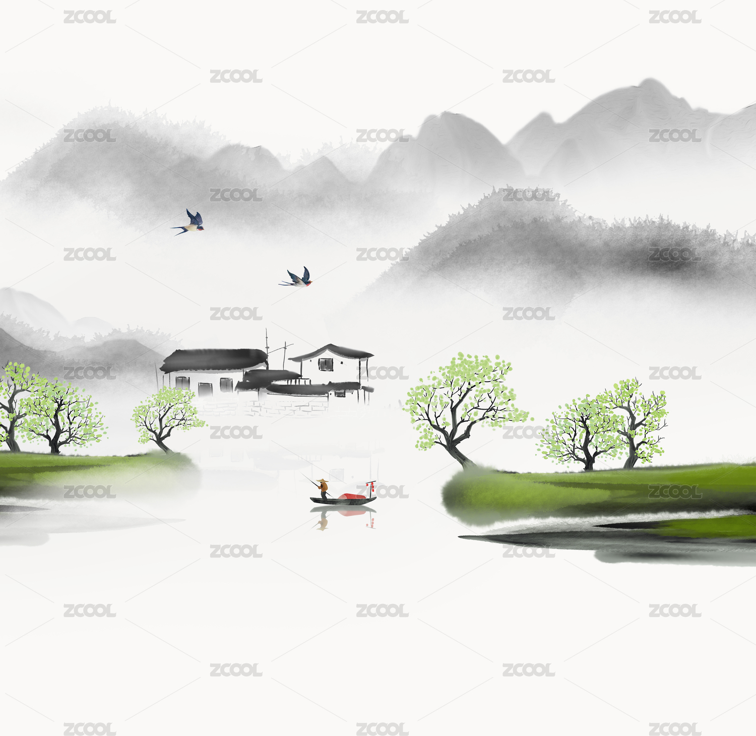 水墨江南江南水鄉(xiāng)山鄉(xiāng)風(fēng)景畫水墨風(fēng)景畫長江風(fēng)景畫鸕鶿