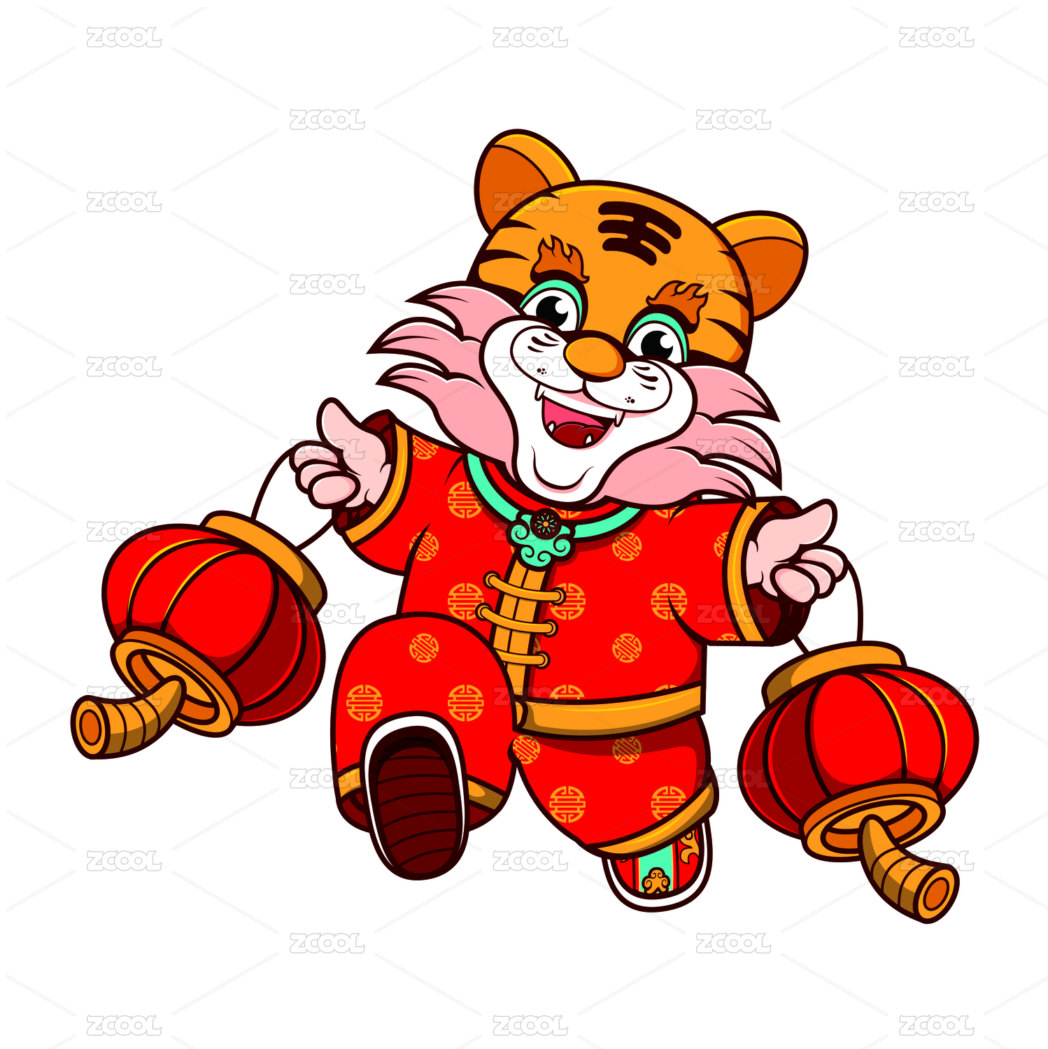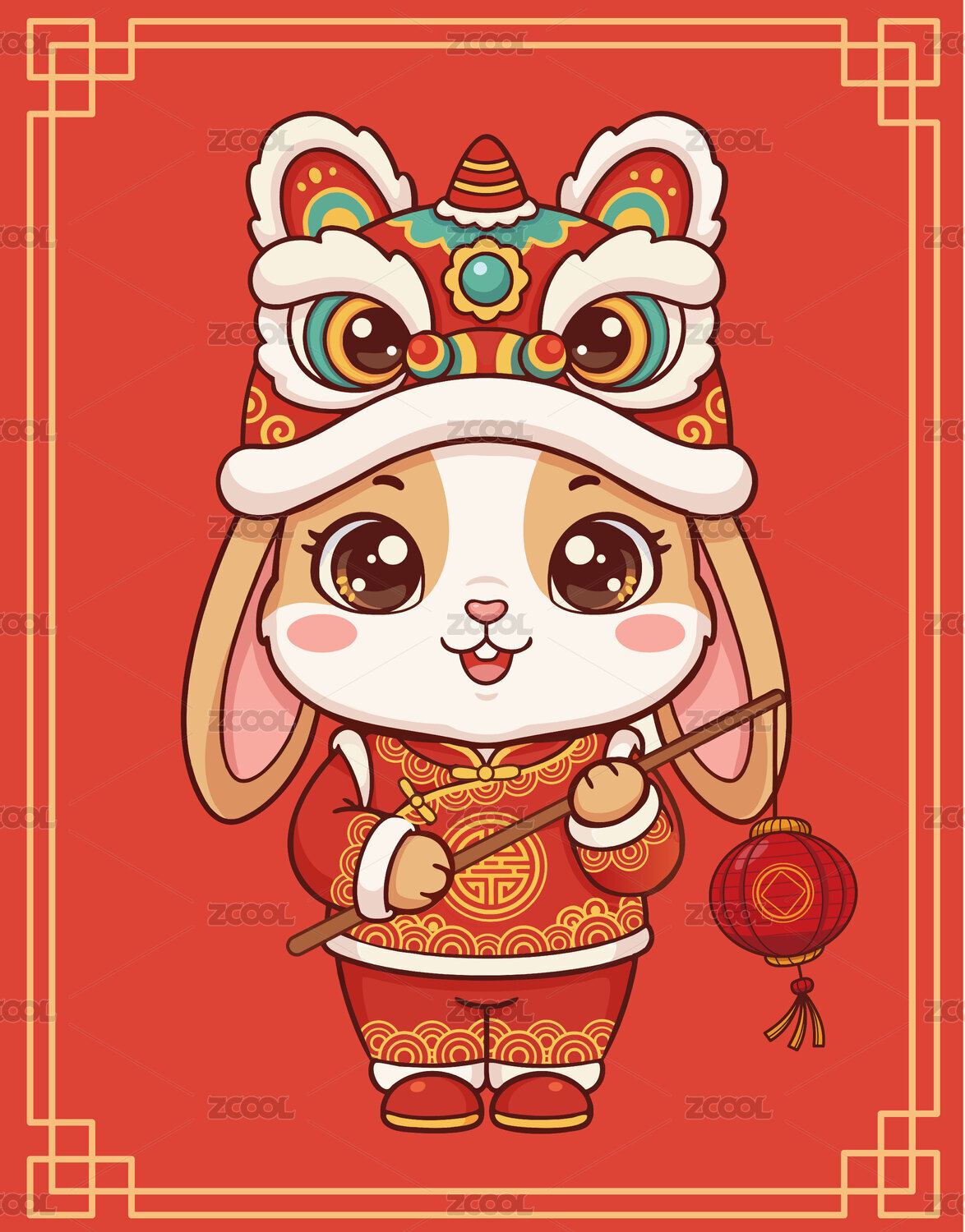 卡通兔子戴醒獅帽手提燈籠新年插畫