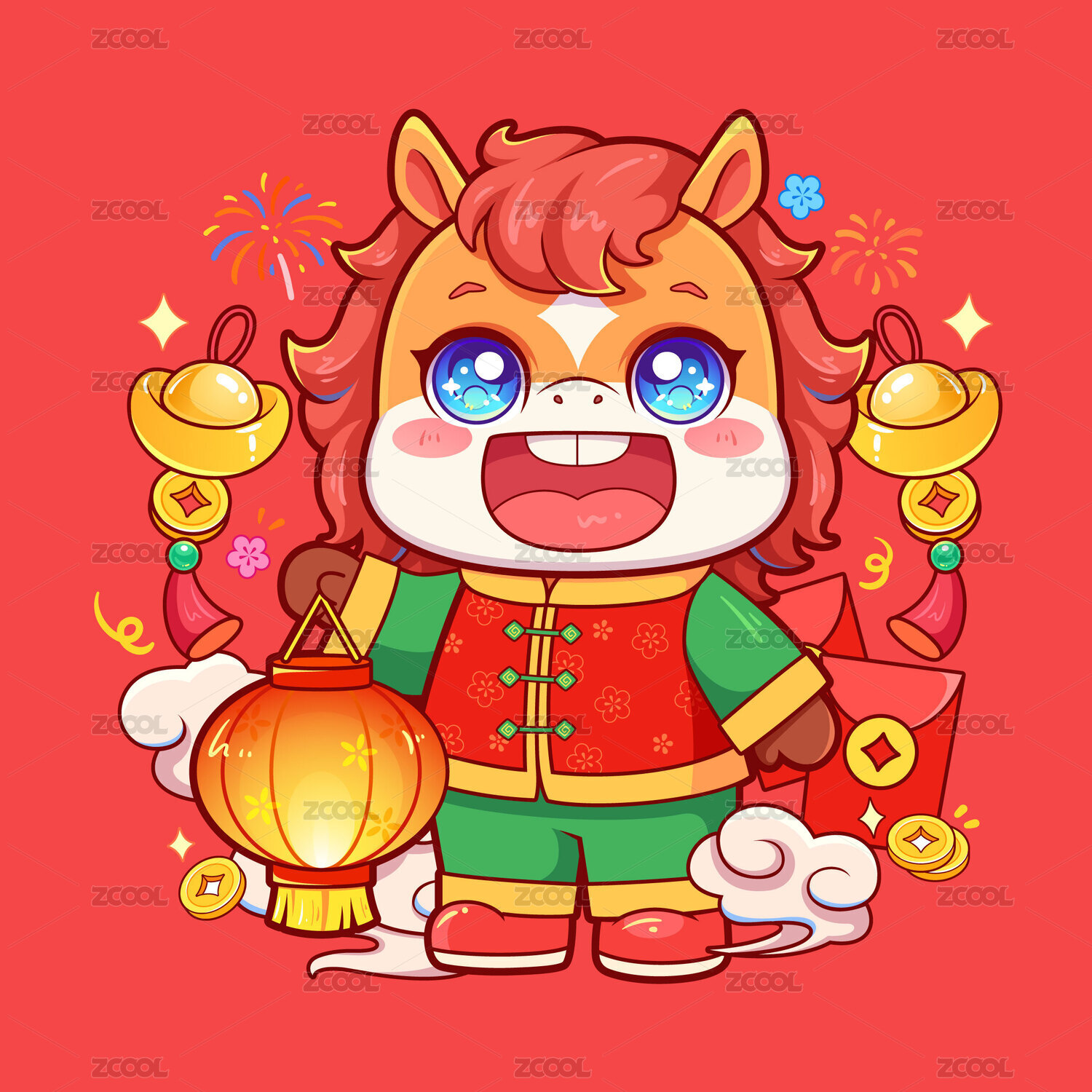 馬年手繪卡通馬吉祥物-喜慶手提燈籠造型