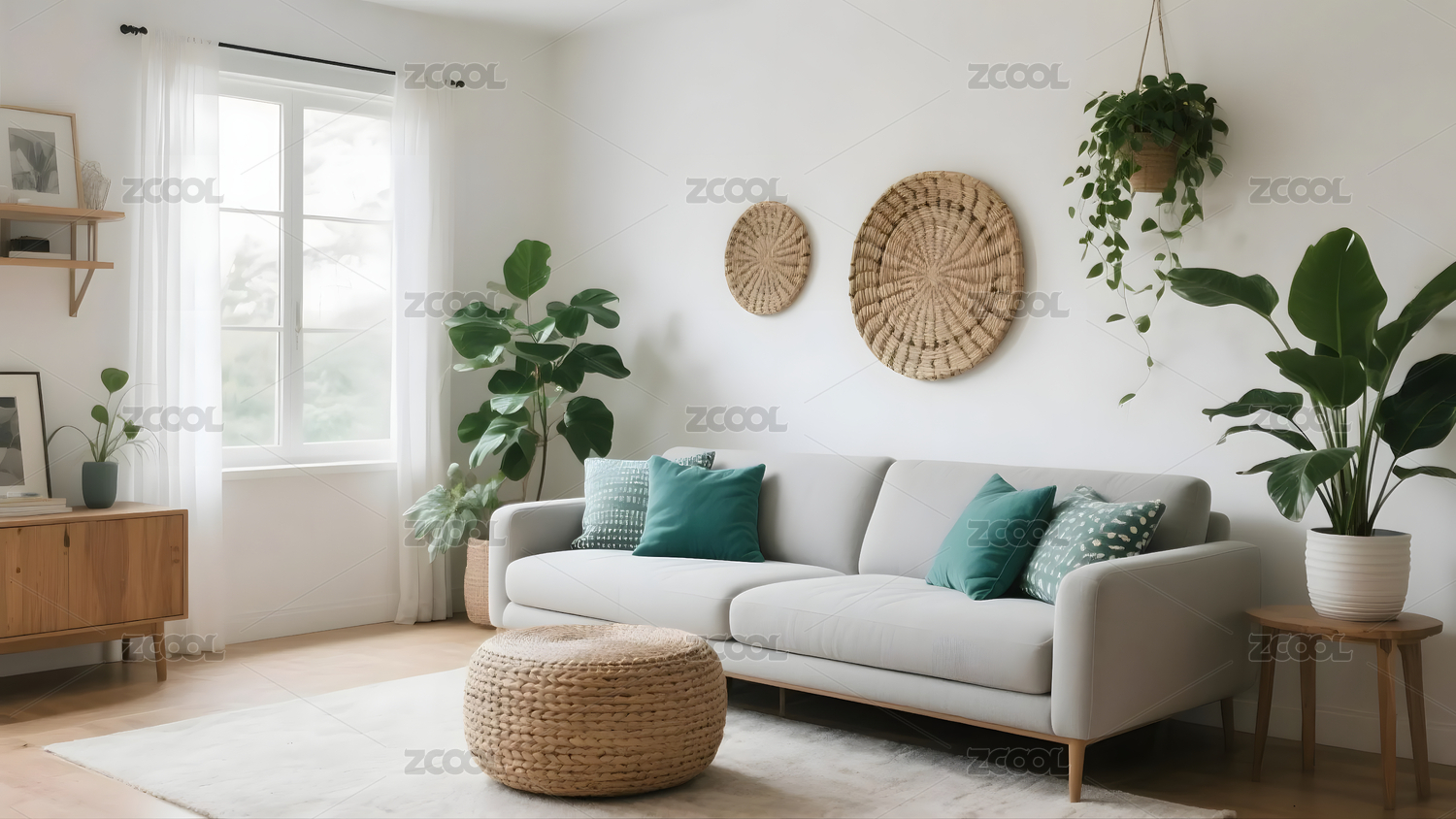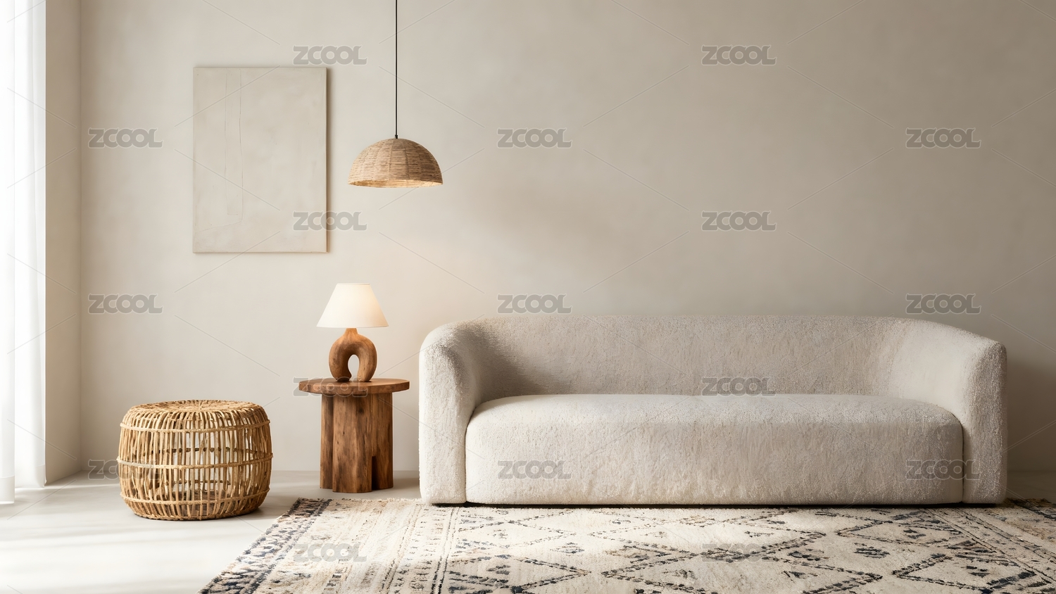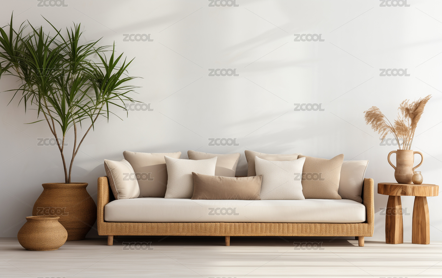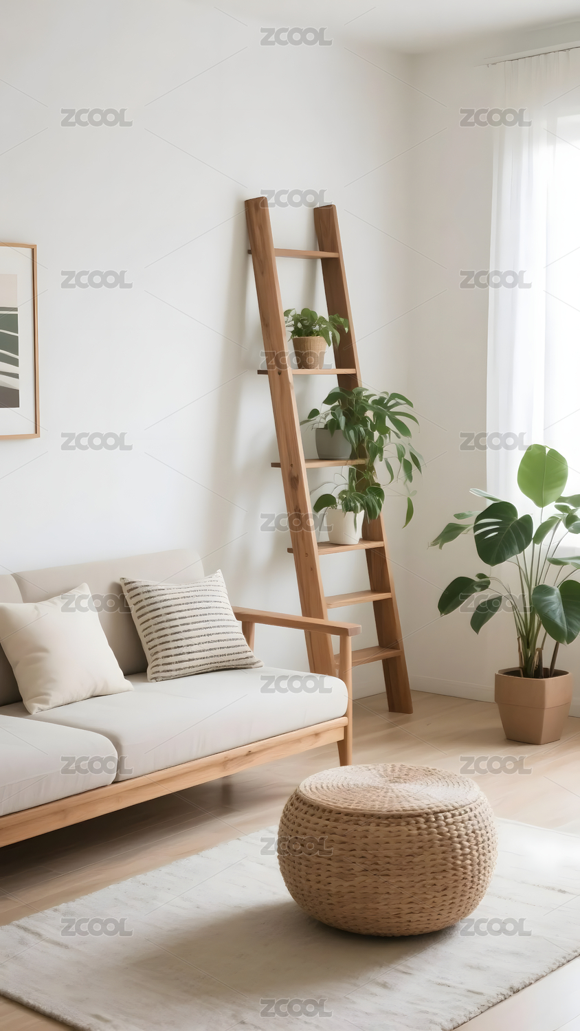 極簡客廳沙發(fā)與藤編裝飾