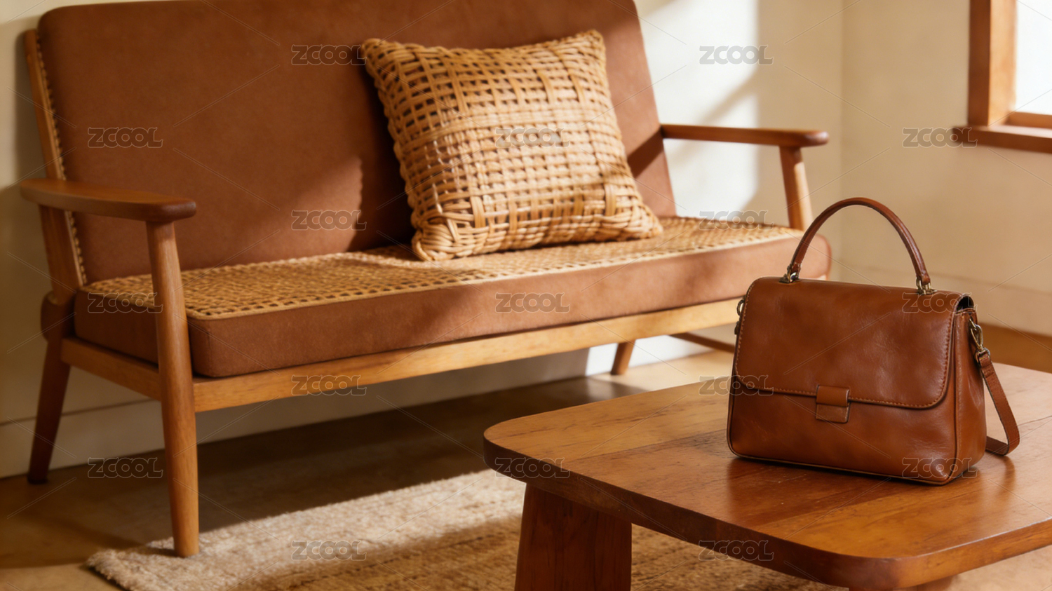 焦糖藤編復(fù)古皮革包與木質(zhì)沙發(fā)的靜謐午后