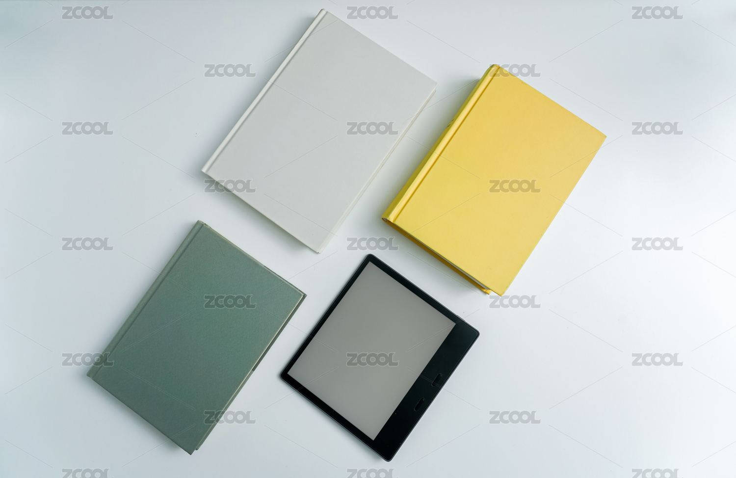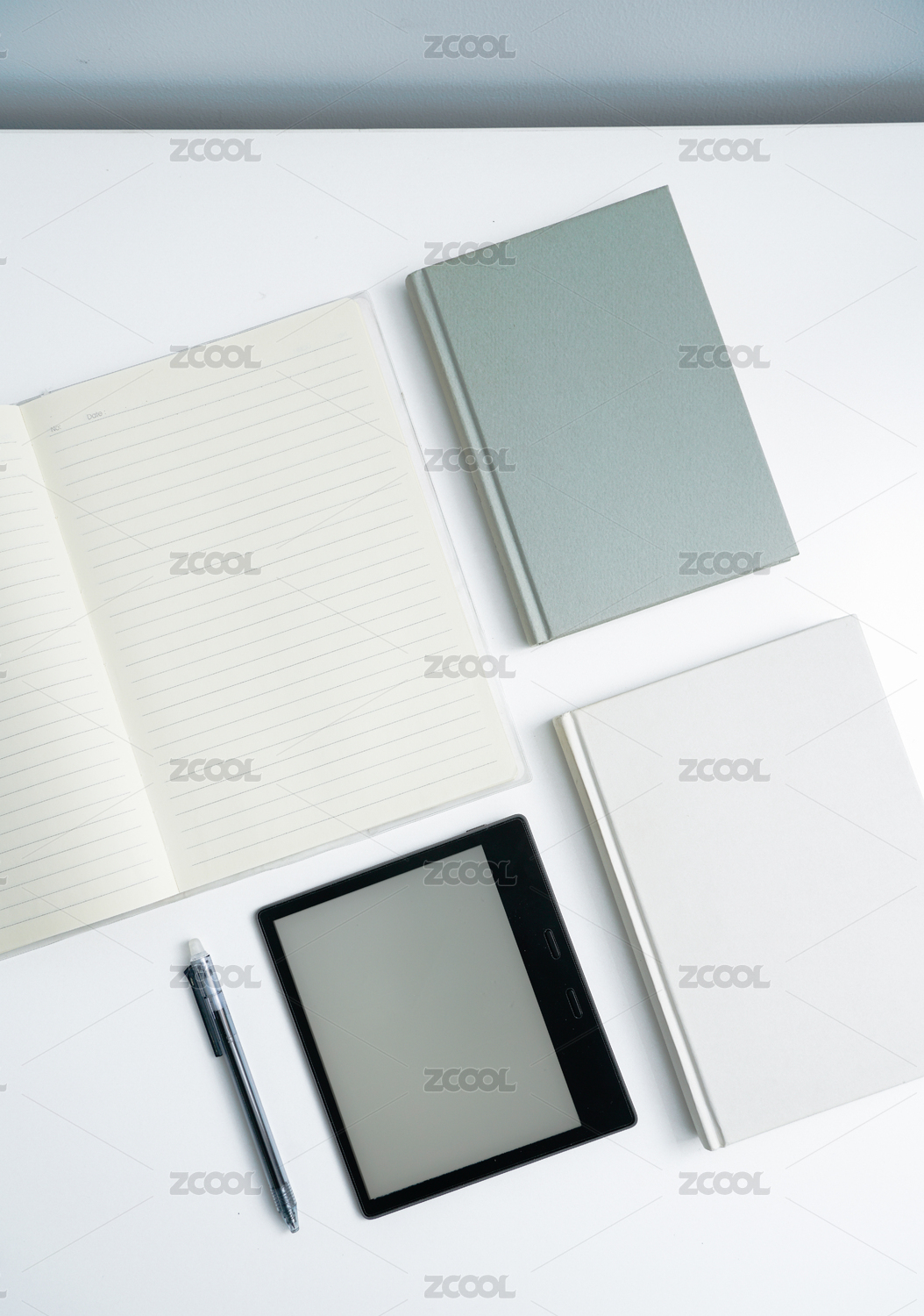 書(shū)和筆記本以及電子書(shū)放在白色桌面