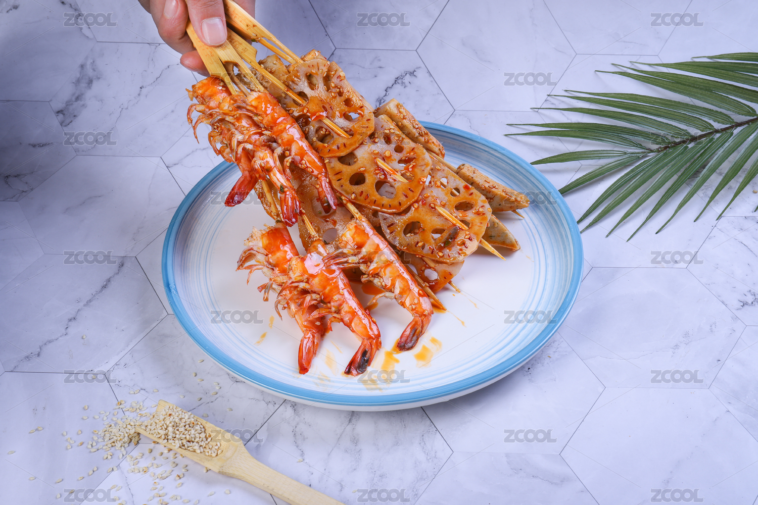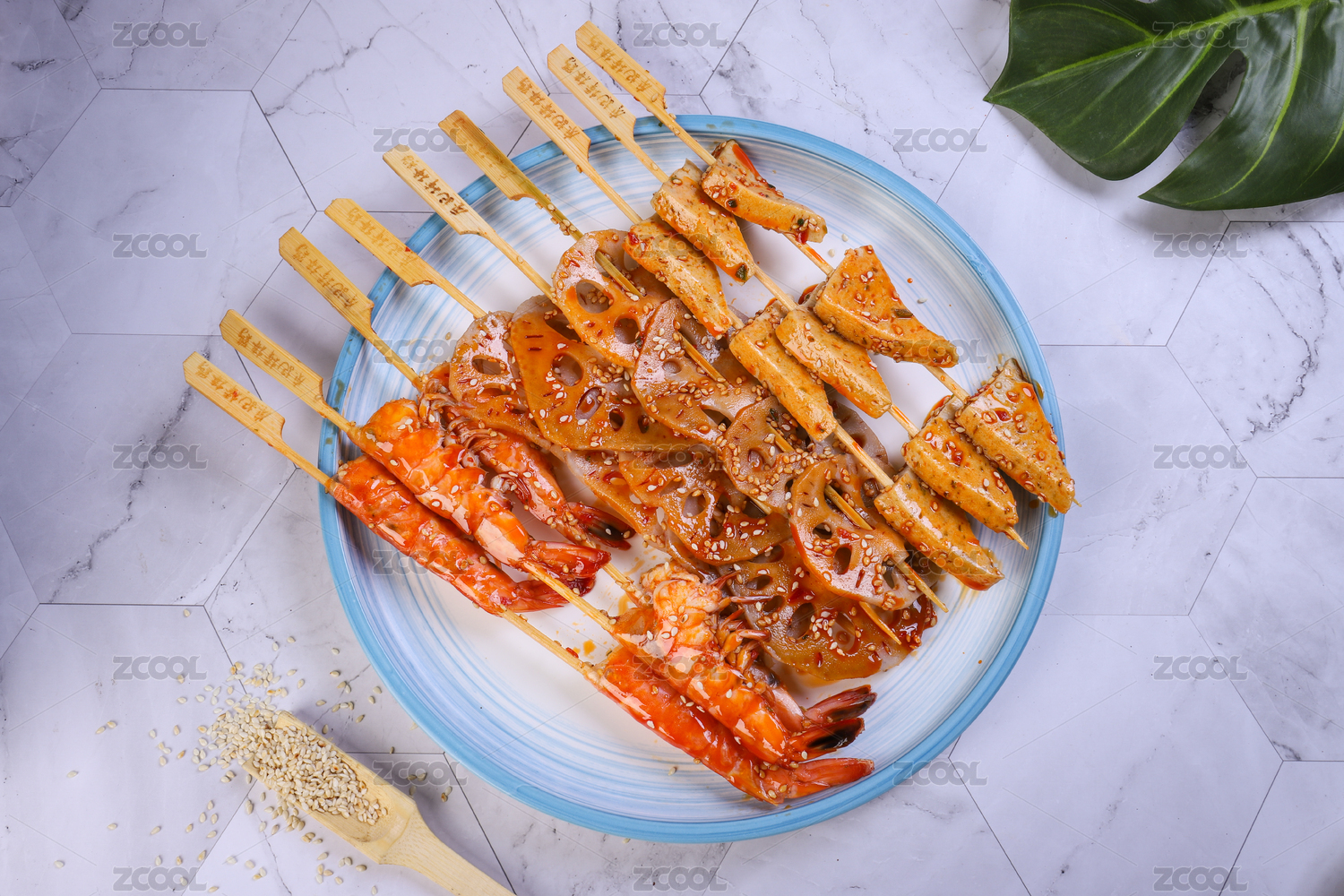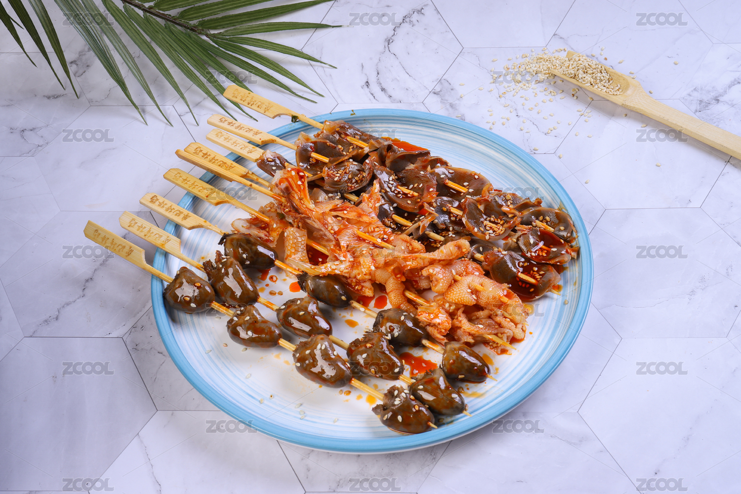 大理石背景上盤子里的冷吃串串