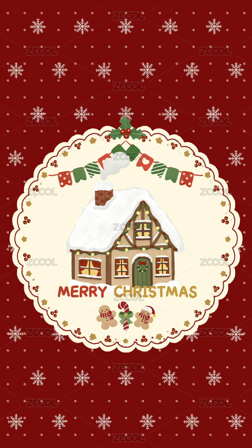 圣誕夜的雪屋紅色背景卡通手繪插畫
