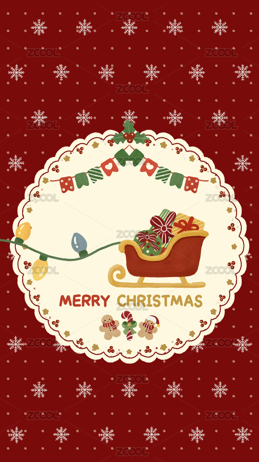 圣誕夜裝滿禮物的雪橇紅色背景卡通手繪插畫
