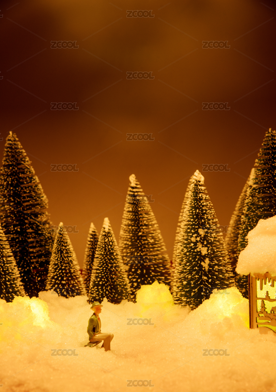 有圣誕雪松的冬季夜景微縮模型場景