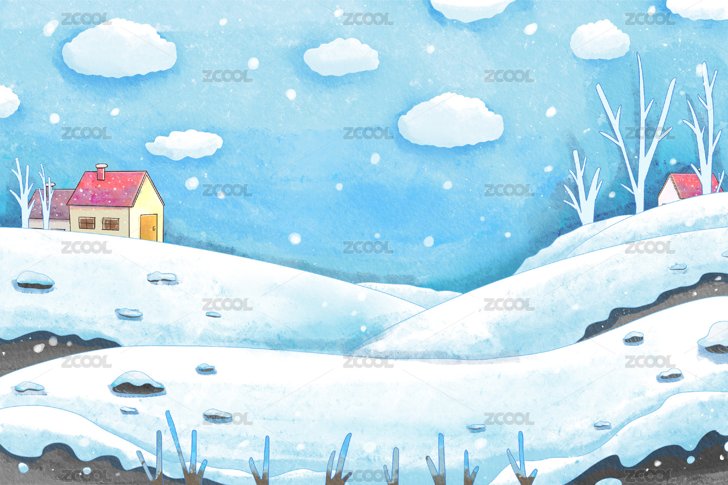 手繪水彩雪地風(fēng)景背景插畫