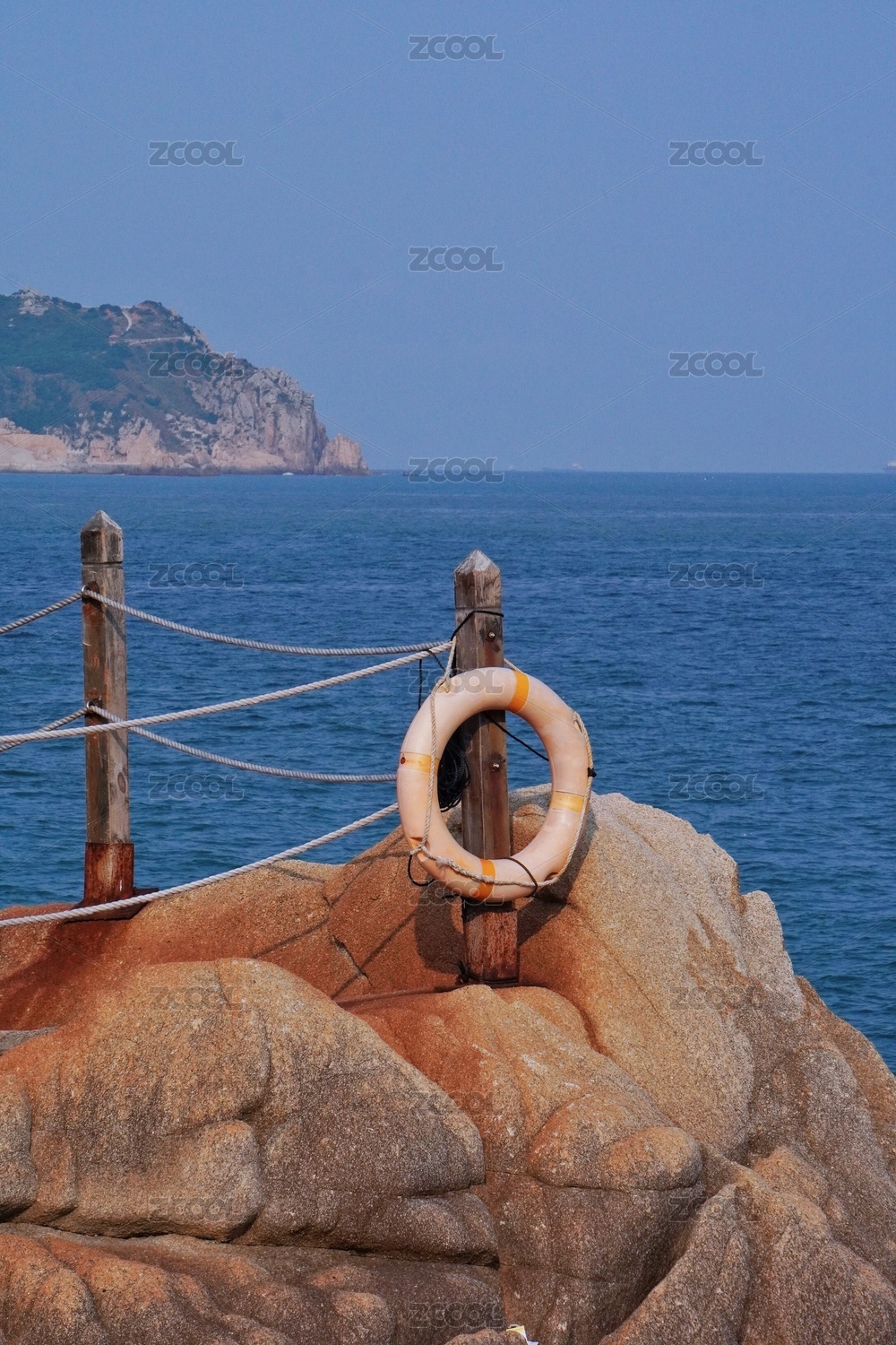 海邊礁石掛著一個(gè)救生圈