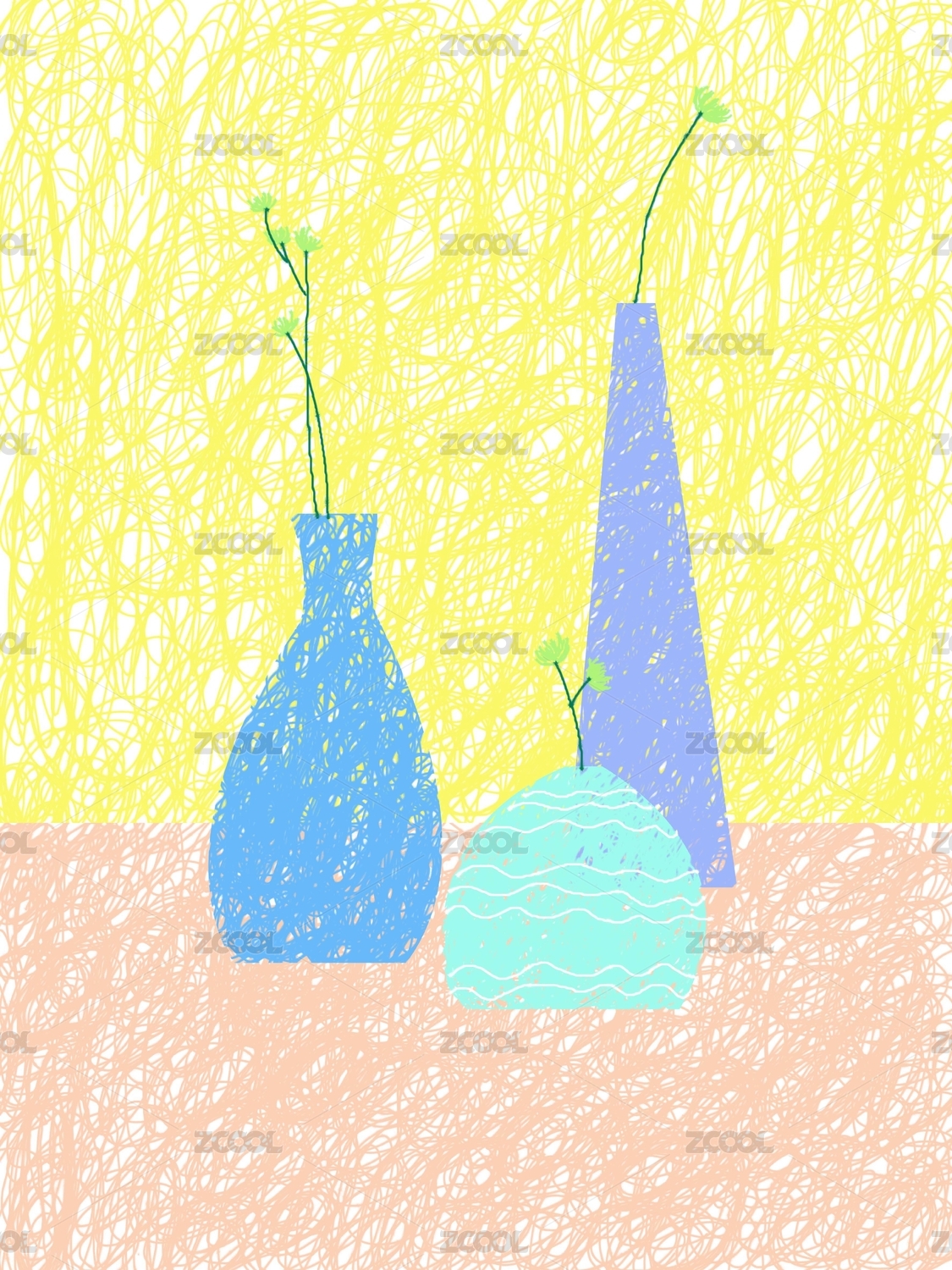 原創(chuàng)插畫線圈畫手繪插畫現(xiàn)代裝飾簡(jiǎn)約淡雅黃色藍(lán)色花插創(chuàng)意畫背景素材花瓶