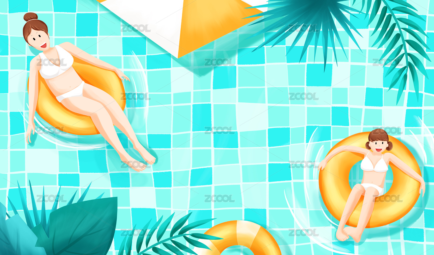 夏季泳池女孩子們坐在游泳圈上游泳插畫