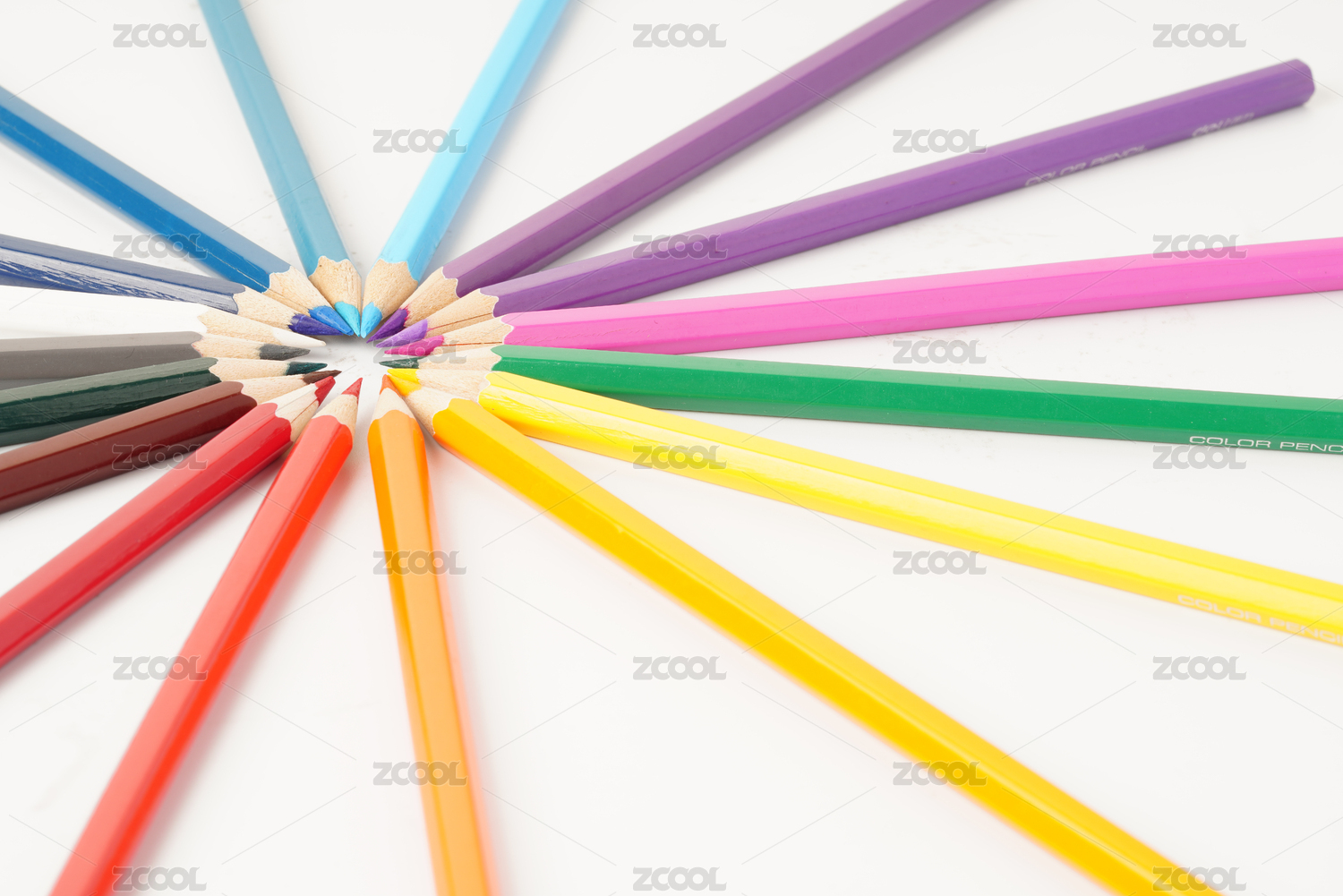 白色背景下圍成一圈的彩色鉛筆特寫