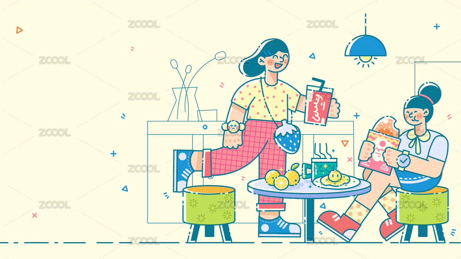 朋友在室內(nèi)聚餐,餐飲美食插畫