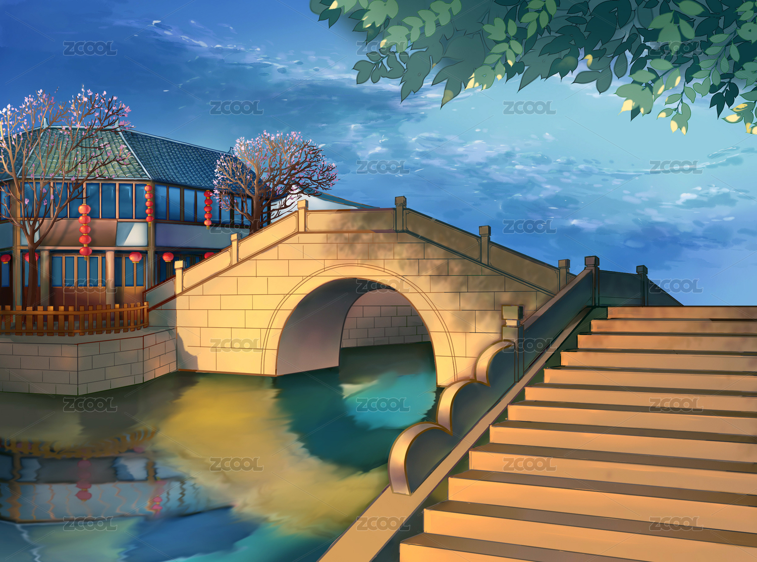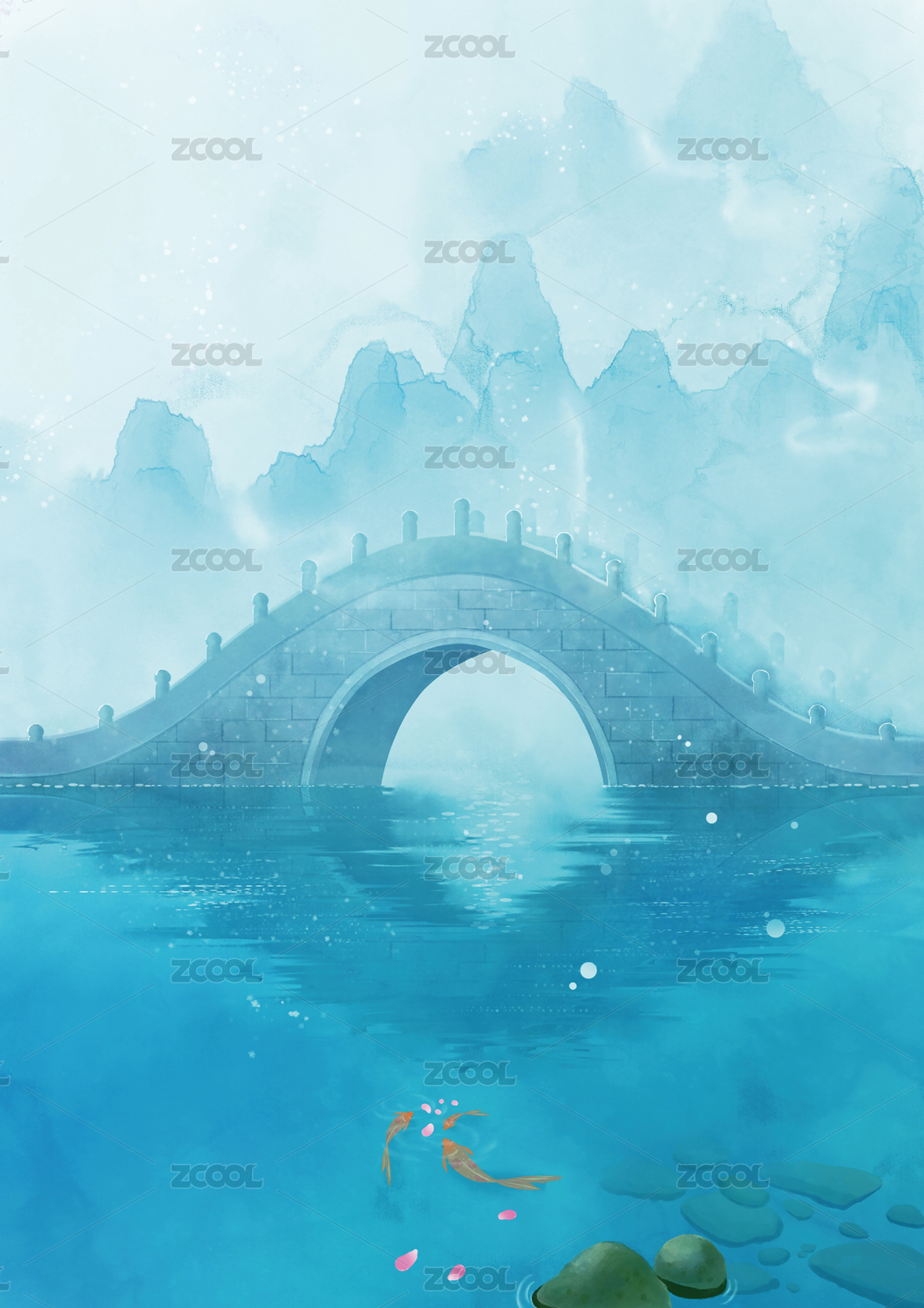 唯美古風(fēng)場(chǎng)景24節(jié)氣小橋流水鯉魚樹枝遠(yuǎn)山