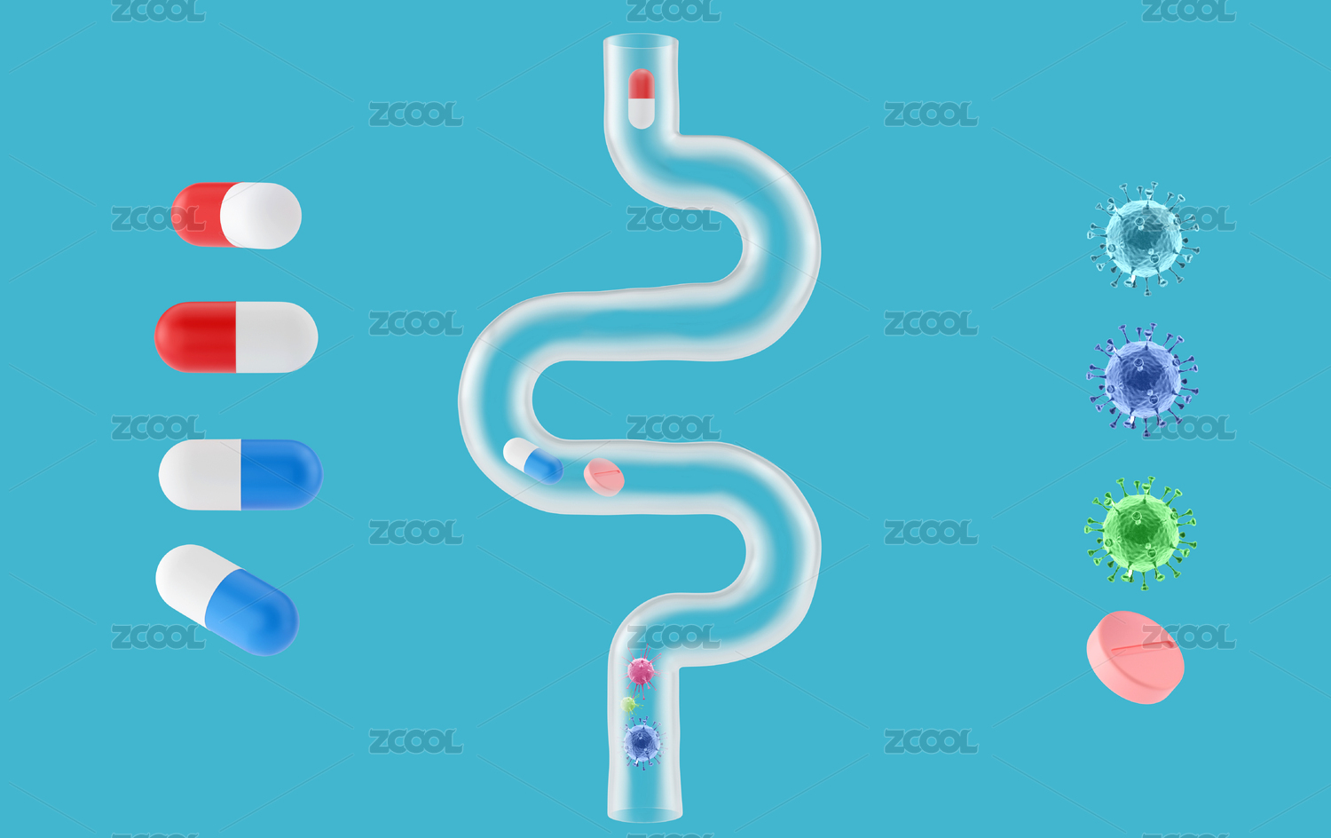 半透明彎曲蠕動的腸道藥物解剖創(chuàng)意圖