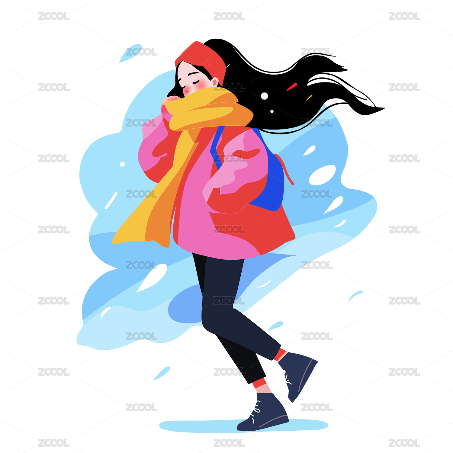 裹著圍巾風(fēng)雪中趕路的女孩插畫(huà)素材