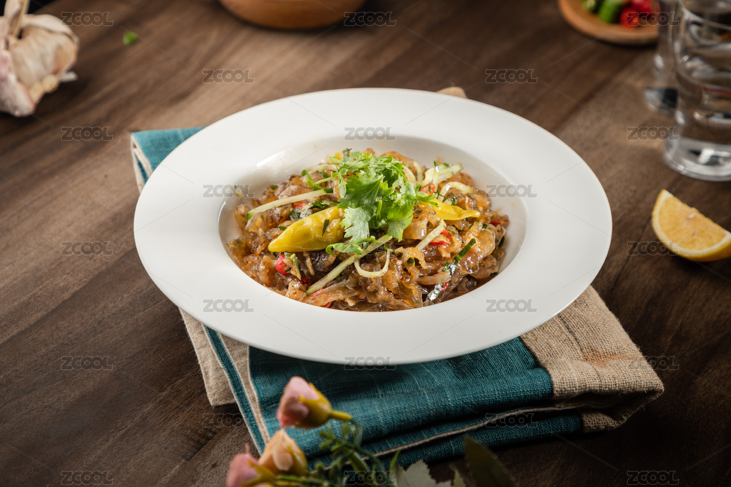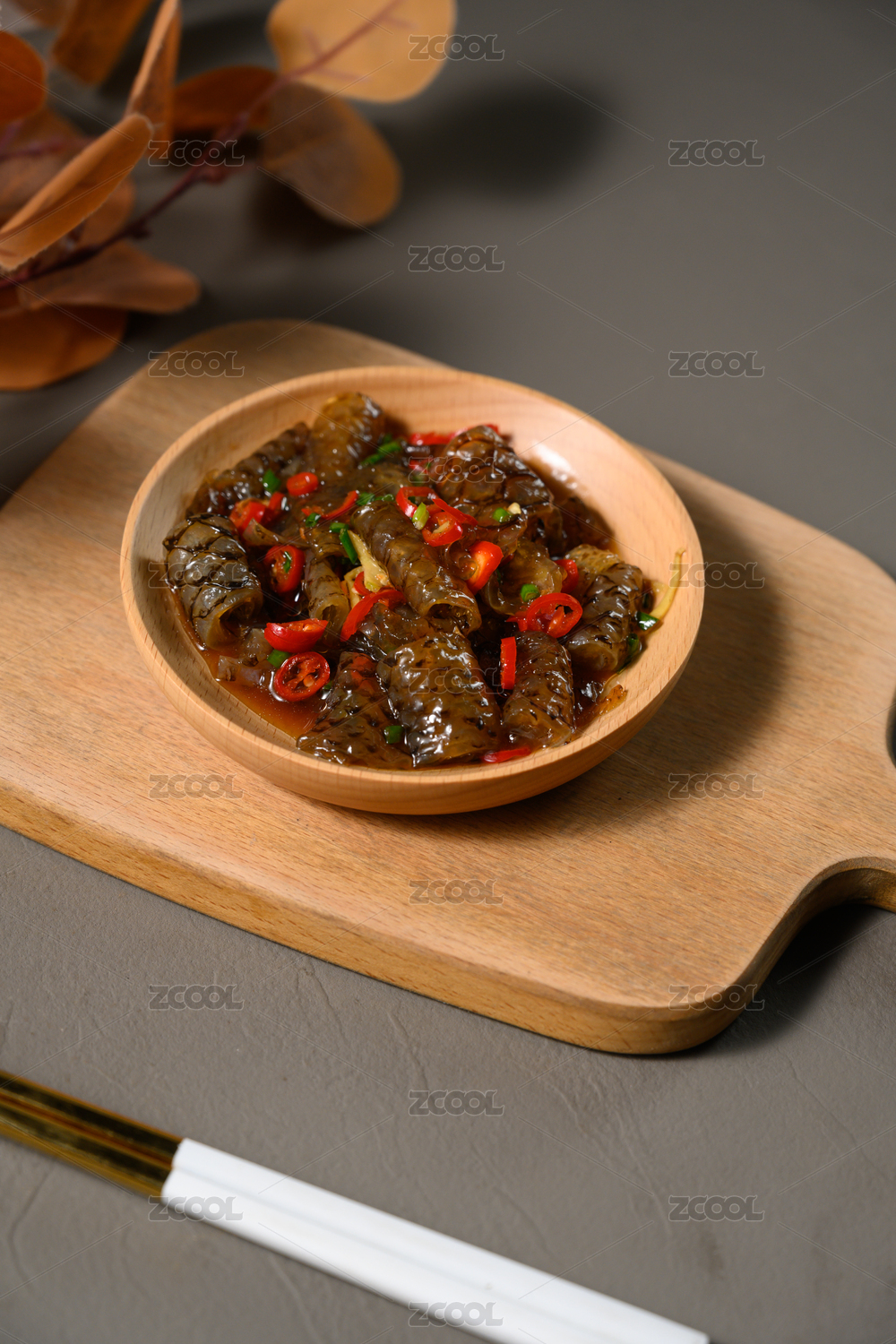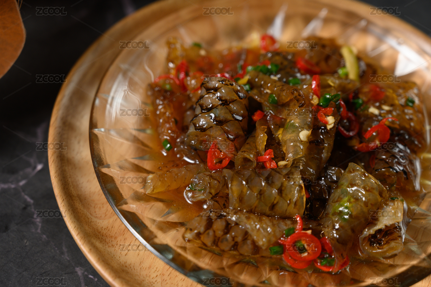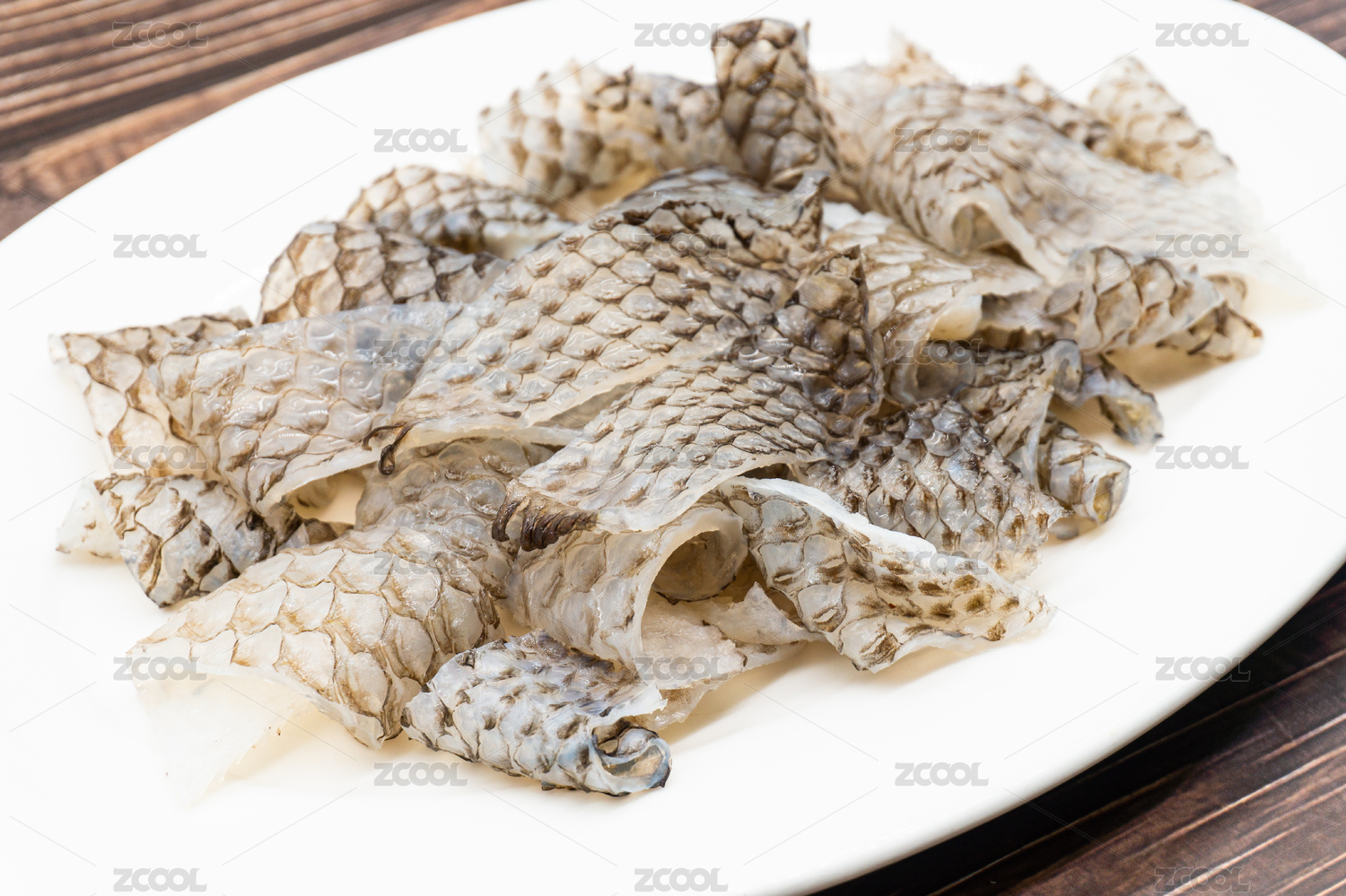 桌面上的木紋盤子里的美味可口的炸魚皮