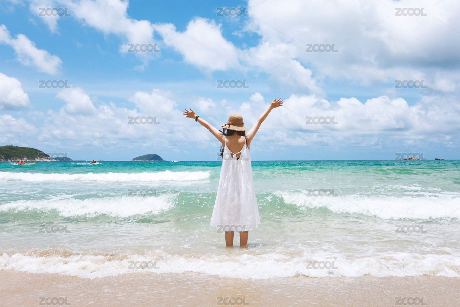 陽光明媚的沙灘上,帶草帽穿白裙子的女孩擁