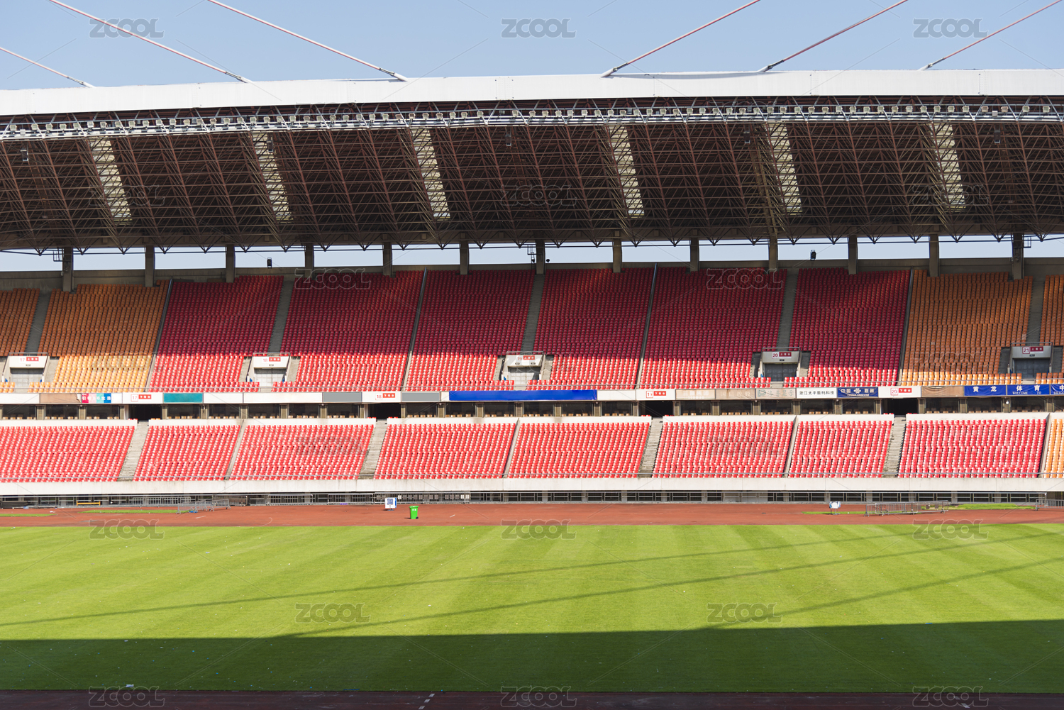 陽光明媚藍(lán)天白云下的現(xiàn)代體育足球場