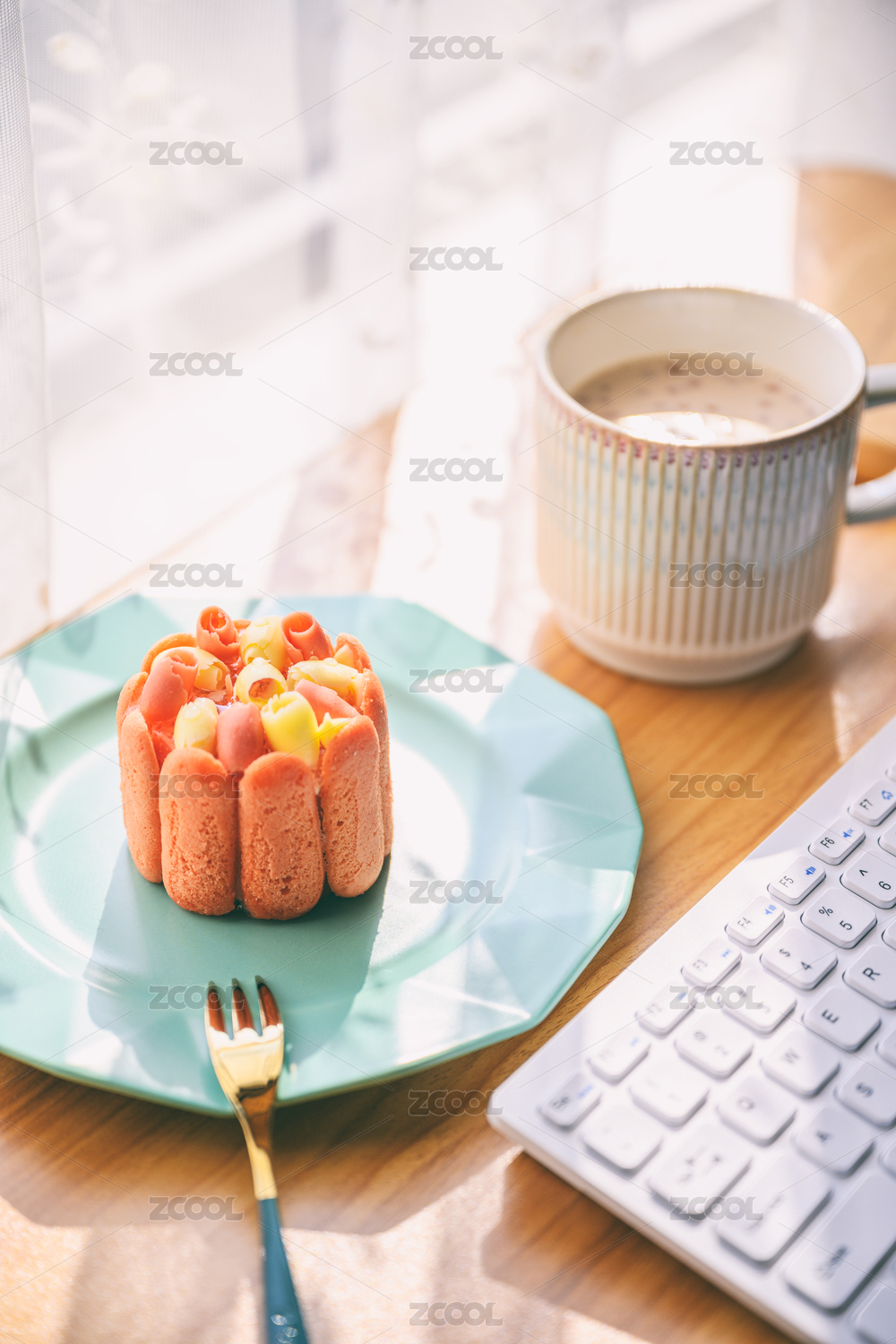 陽光明媚的天氣放在辦公桌上的蛋糕