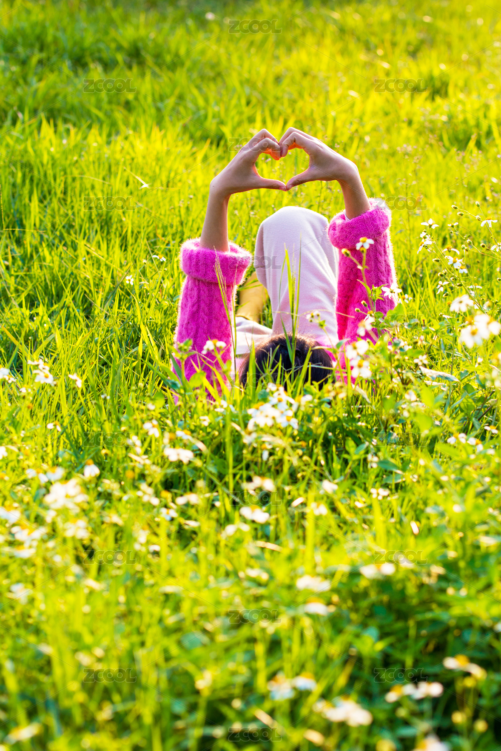 明媚陽光下一個(gè)女孩在草地上休憩