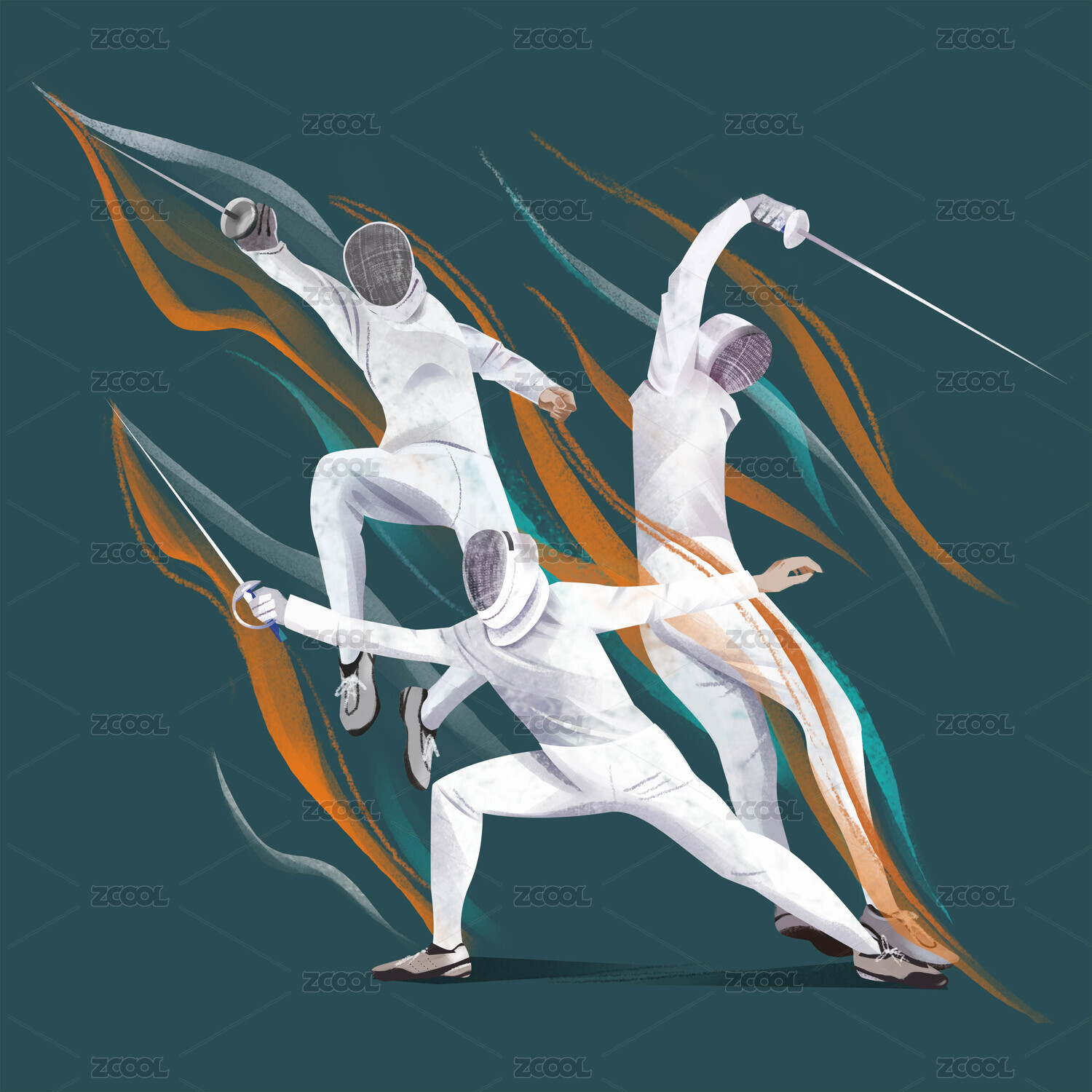 水彩運(yùn)動(dòng)奧運(yùn)擊劍國潮
