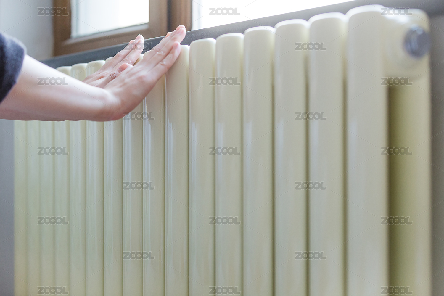 冬季北方開始供暖,把手放在暖氣上取暖。