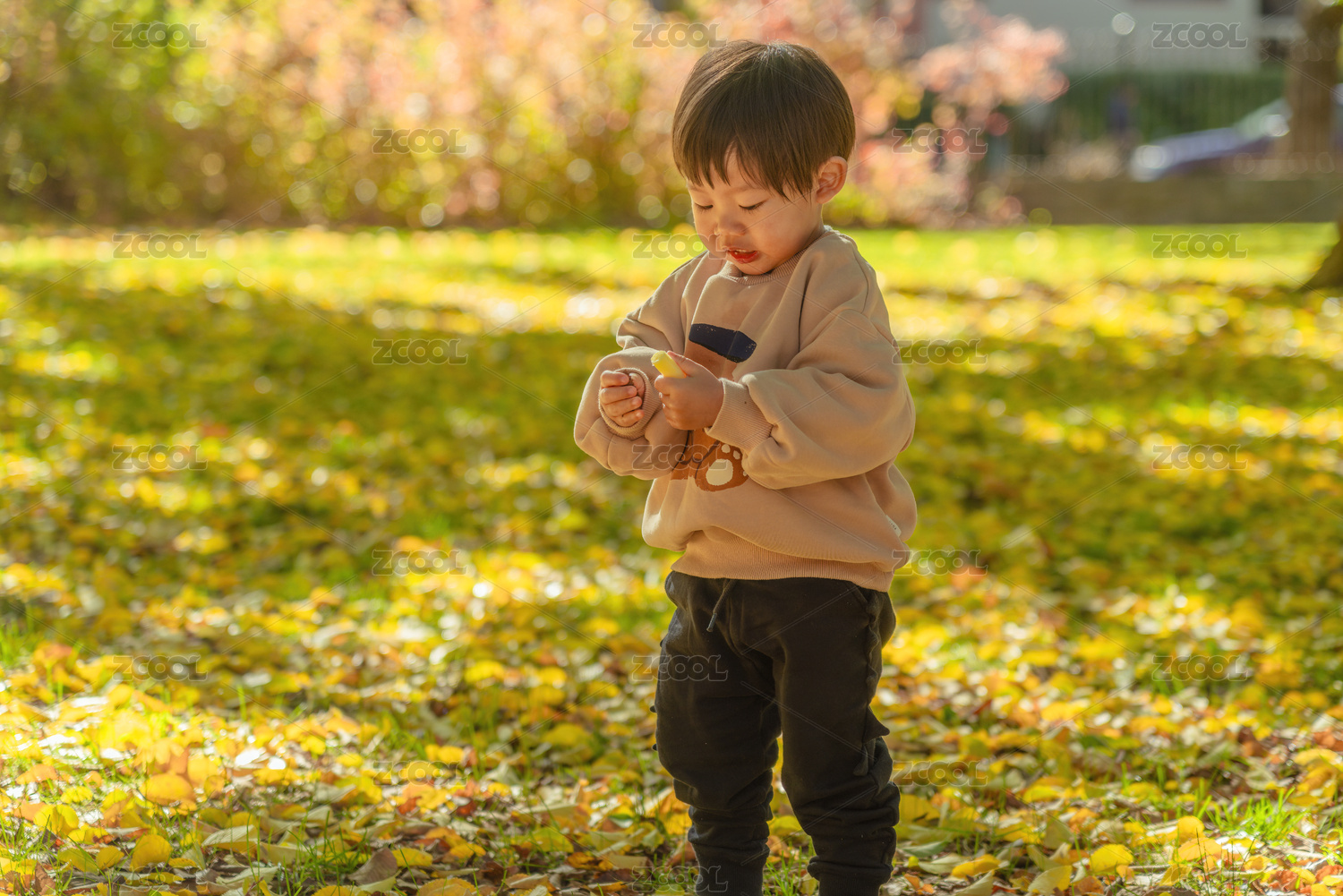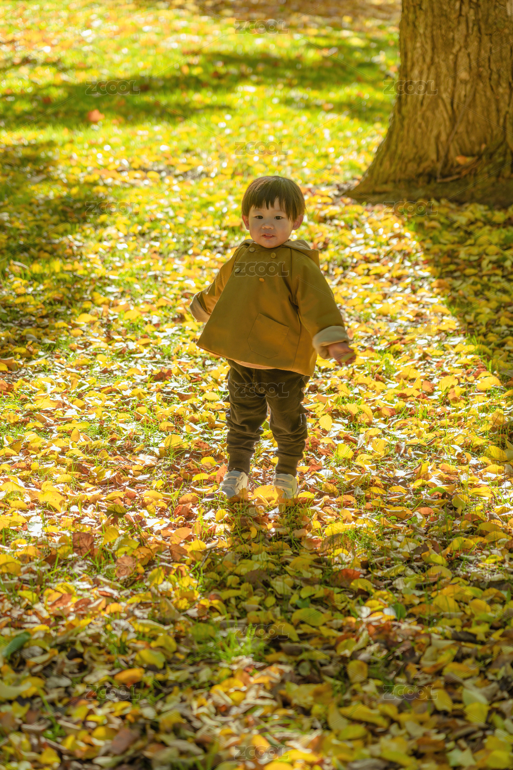 金色的樹林中可愛的小男孩