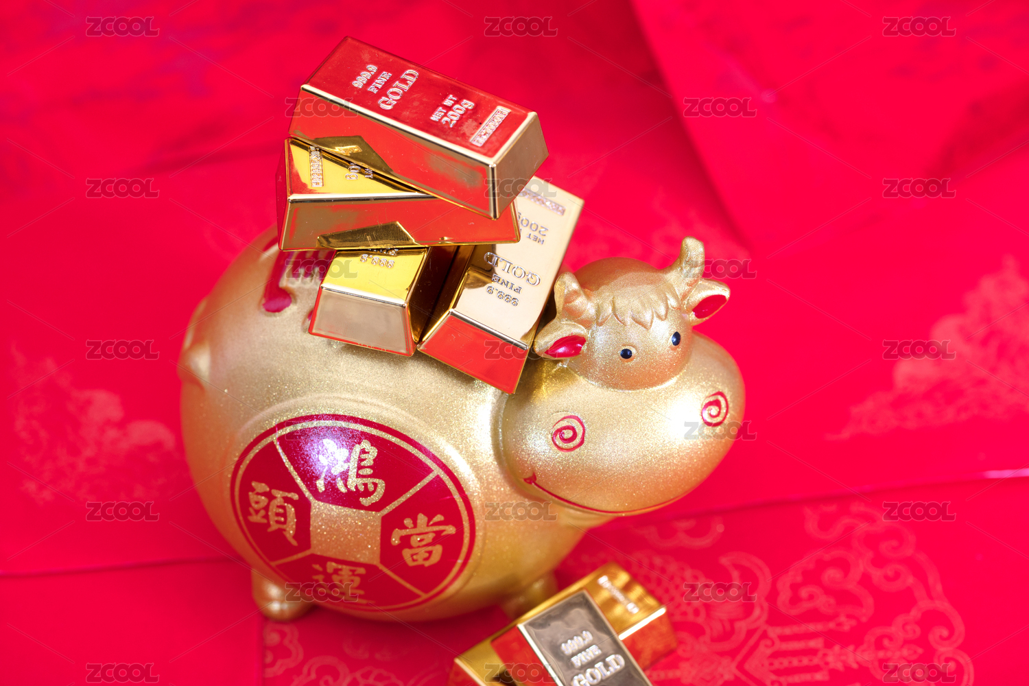 喜慶紅色背景上的金牛存錢(qián)罐背著金塊