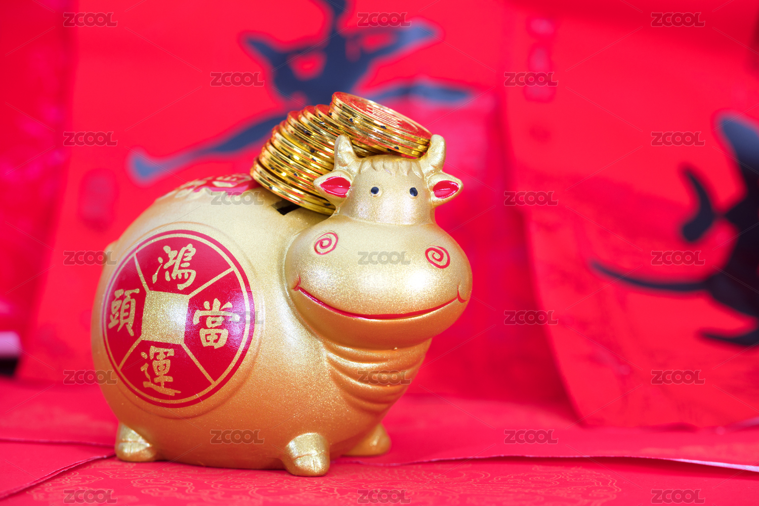 喜慶紅色背景上的金牛存錢(qián)罐背著一堆金幣