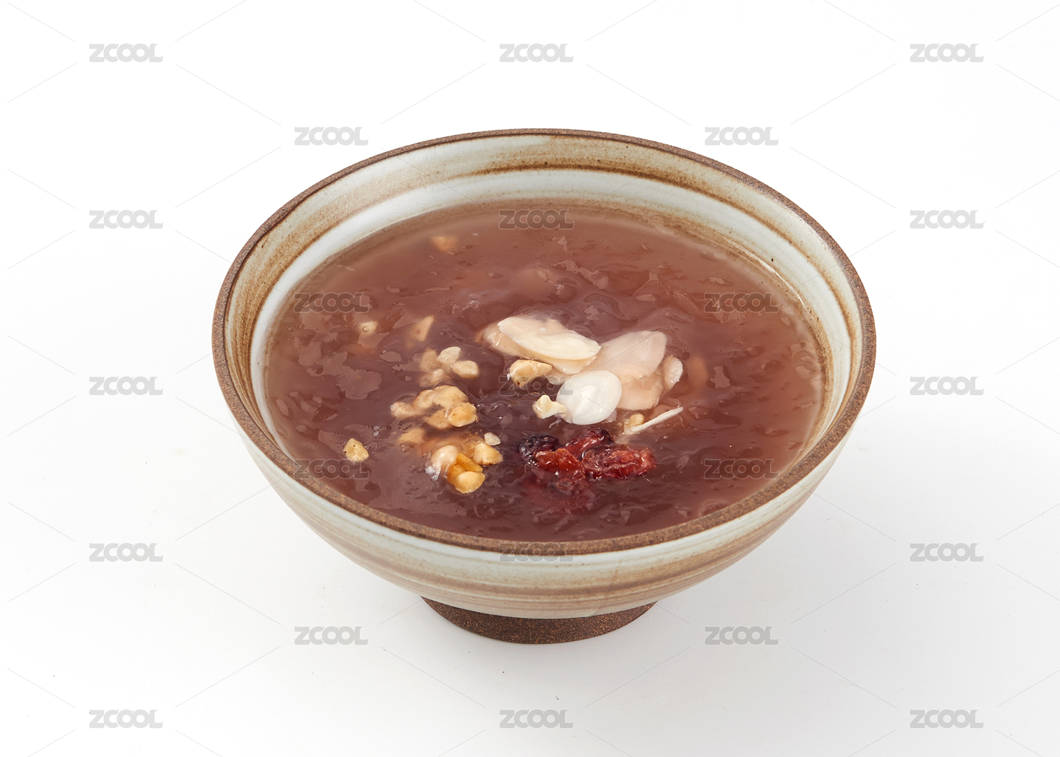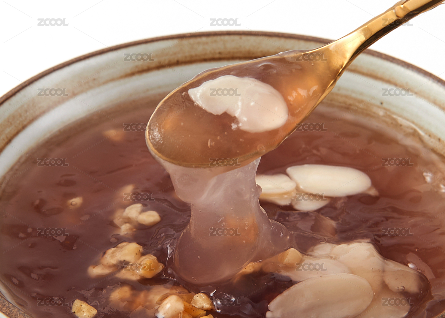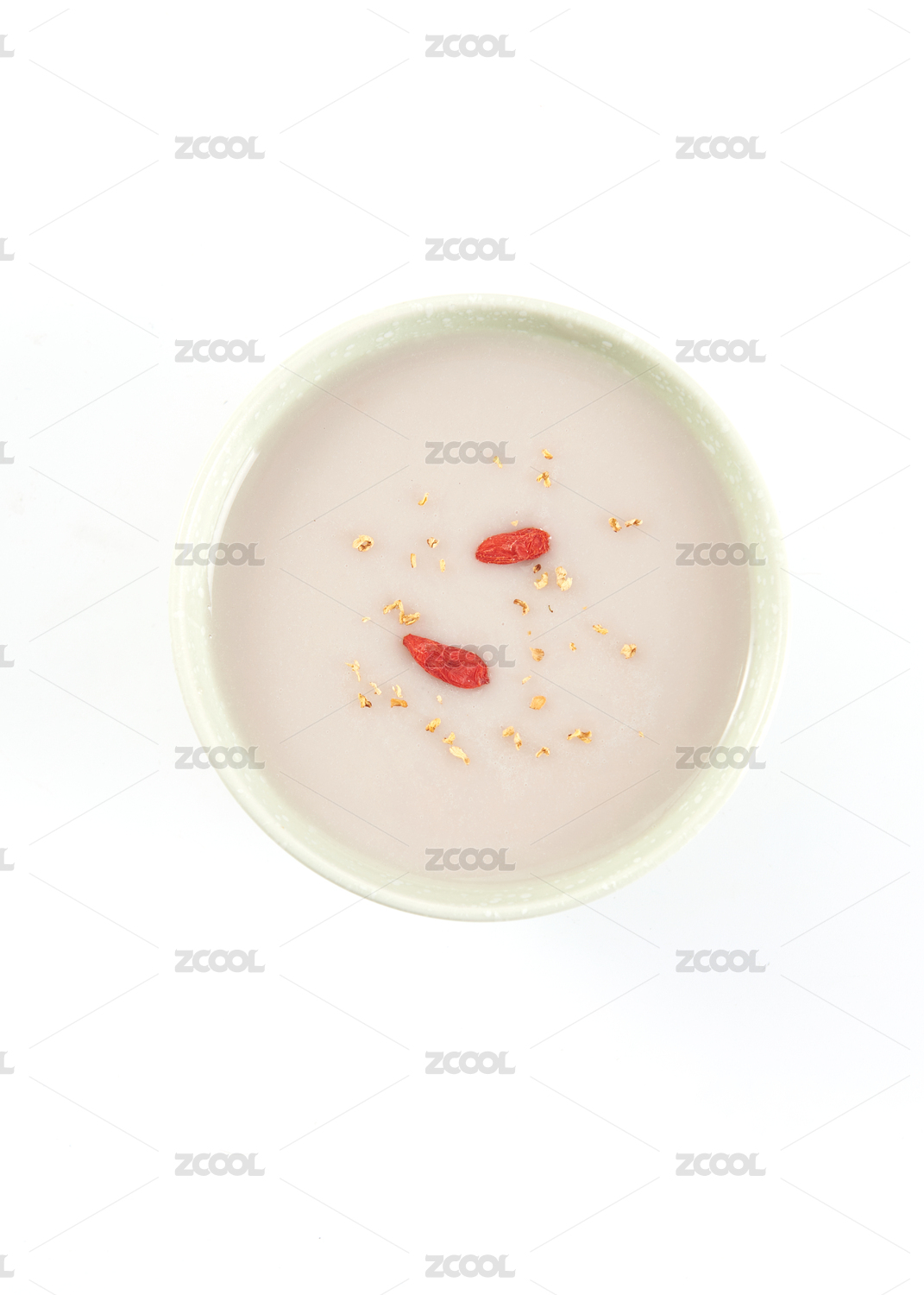 白背景上擺放的沖泡好的藕粉杏仁茶