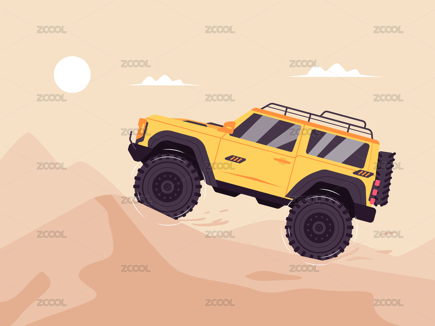 一輛越野車正在沙漠上行駛矢量扁平插畫