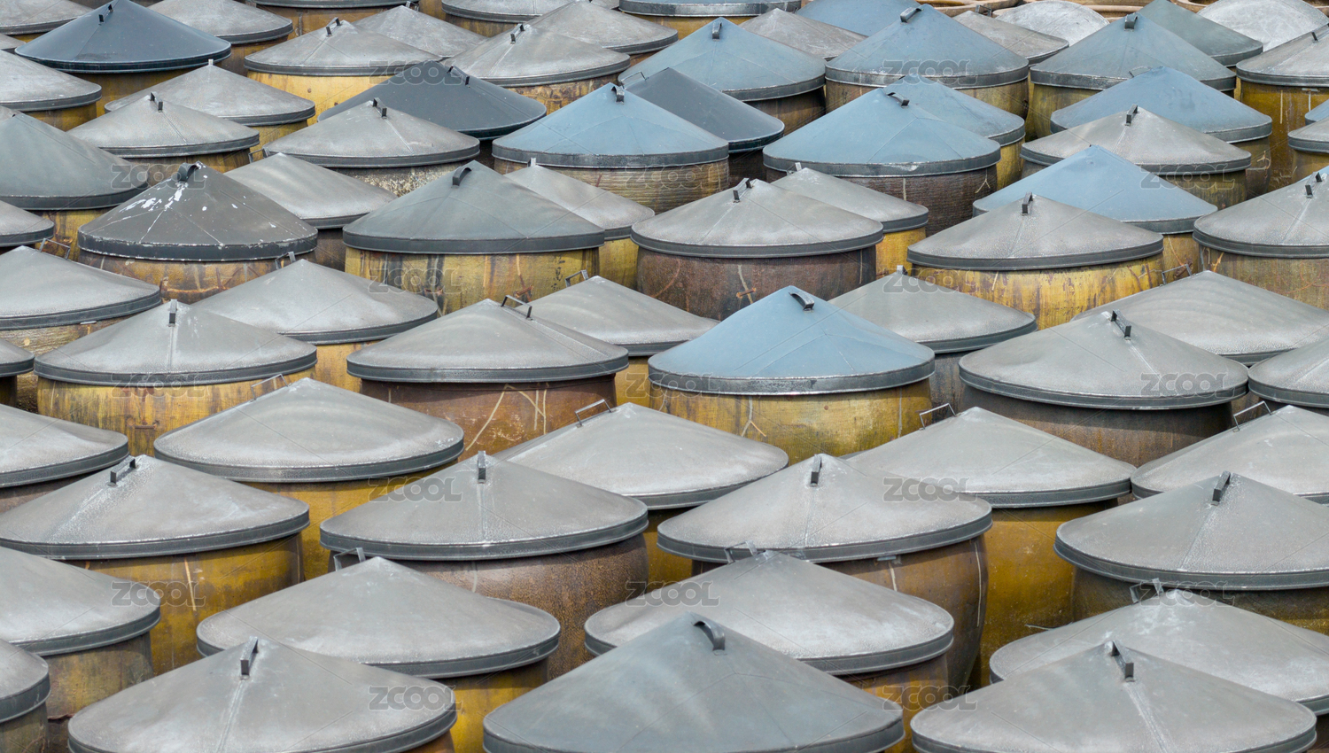 浙江紹興安昌古鎮(zhèn)非遺產(chǎn)傳承排列整齊的醬缸