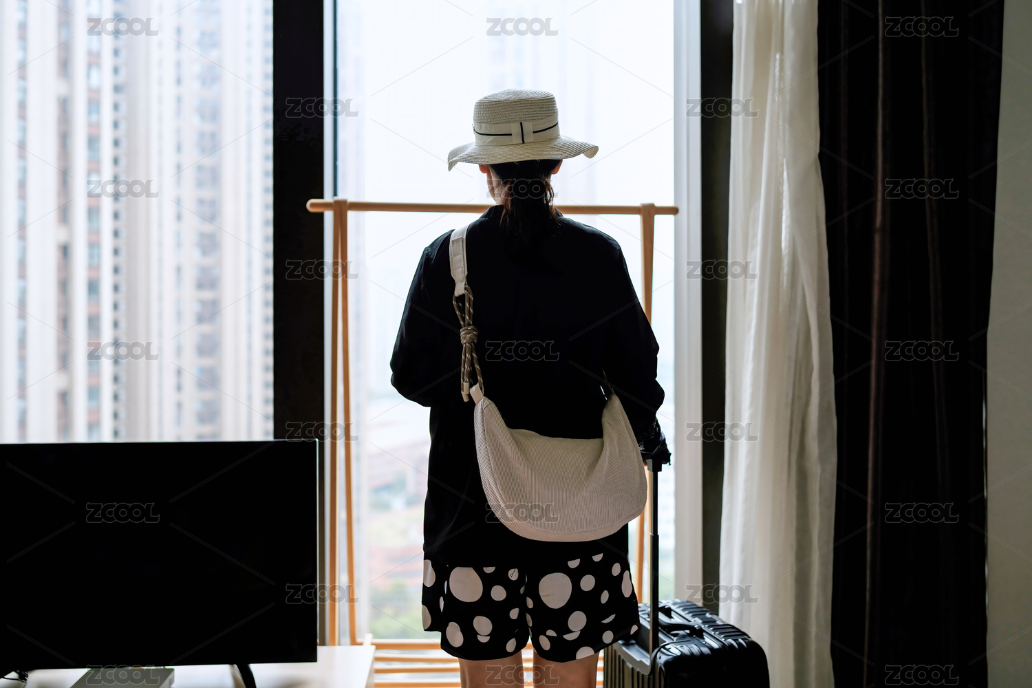 一個女人站在窗前準(zhǔn)備以城市景觀度假旅行