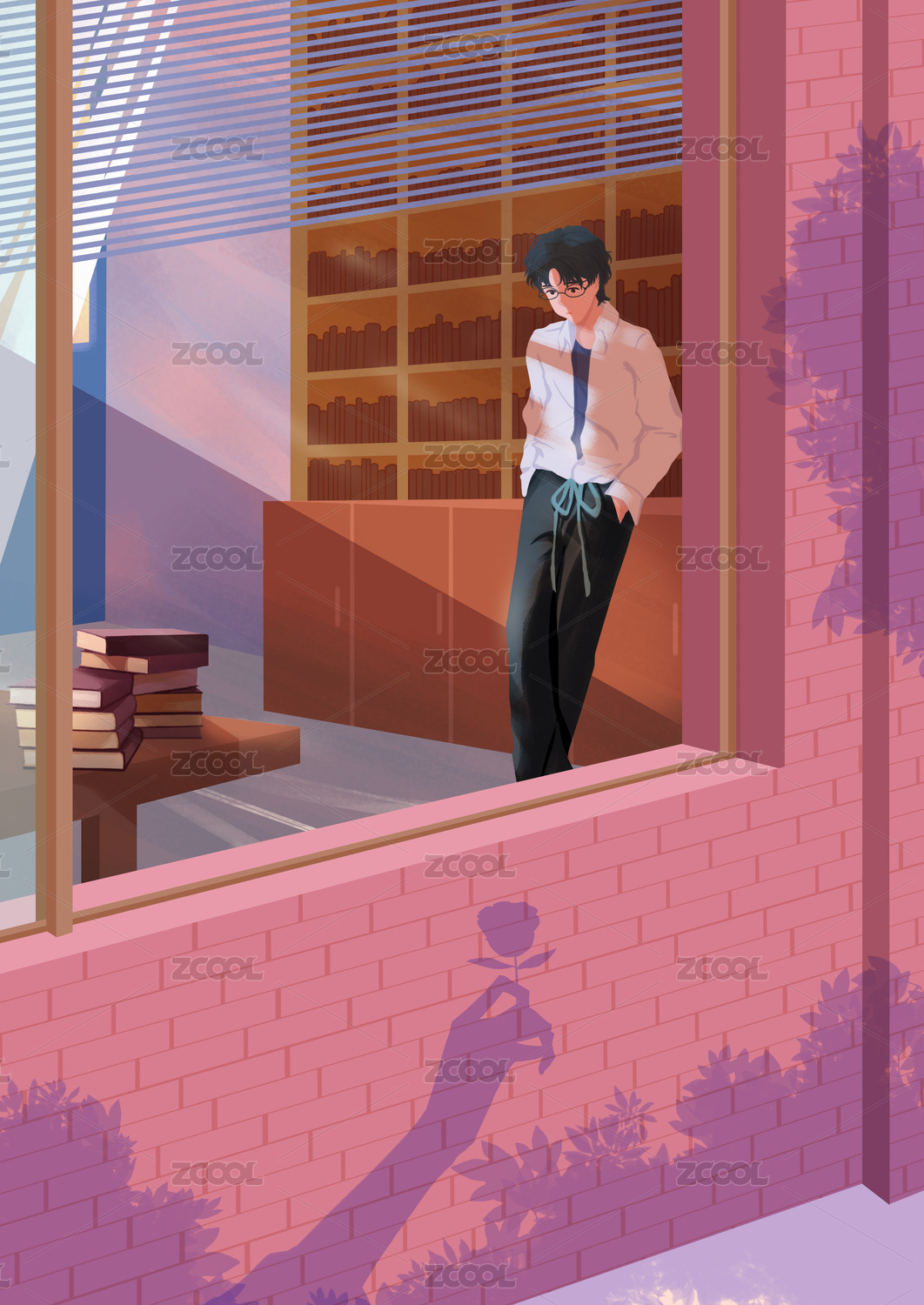 戴眼鏡的男孩在書房里站著