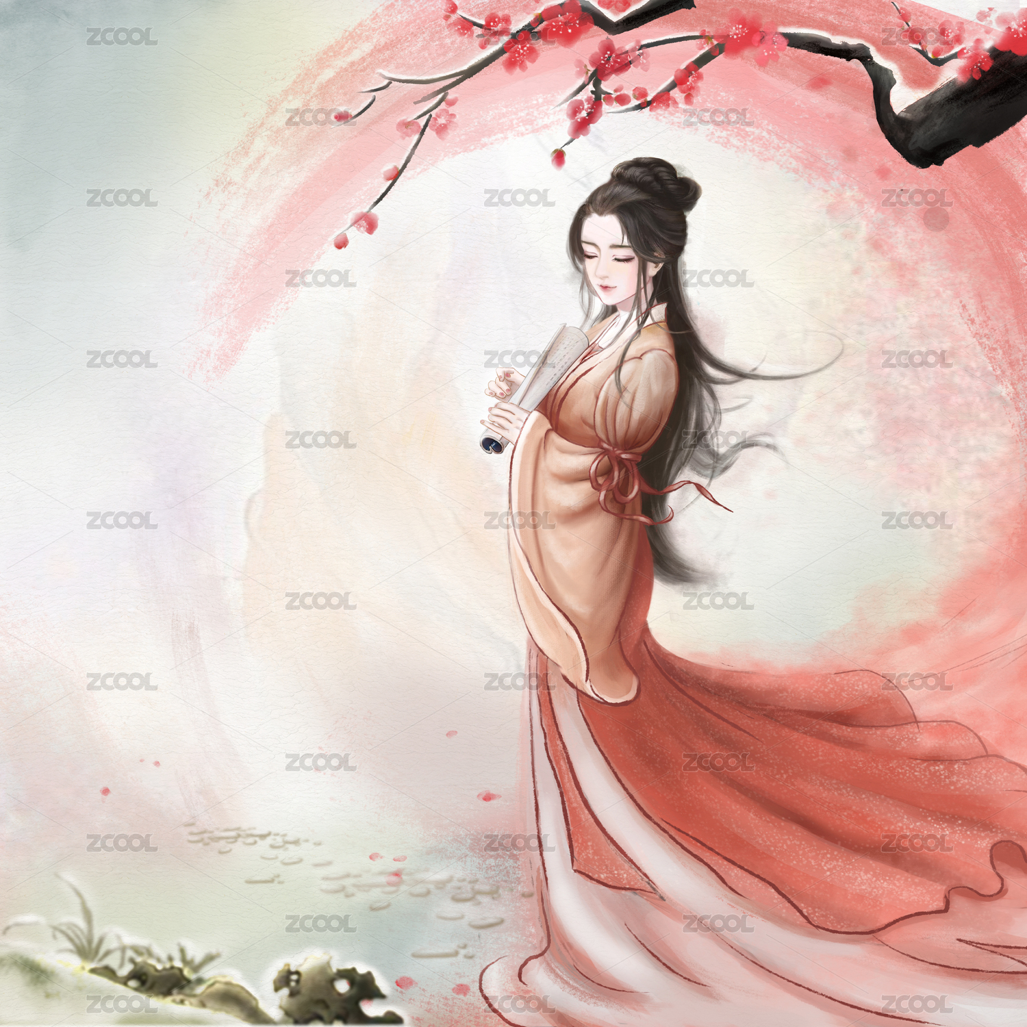 雪后梅花下站著手拿書沉思的紅衣少女