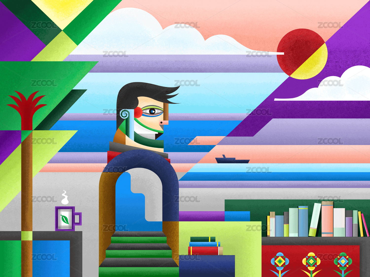 一位男性在海邊沉思冥想 背景是大海和書籍