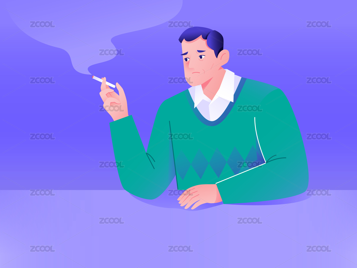 一個老人點(diǎn)了一支煙坐著抽煙思考醫(yī)療插畫