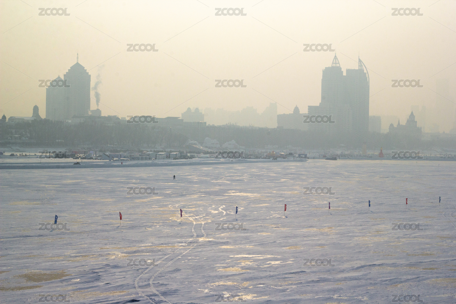 中國(guó)黑龍江哈爾濱松花江面上白雪腳印和高樓