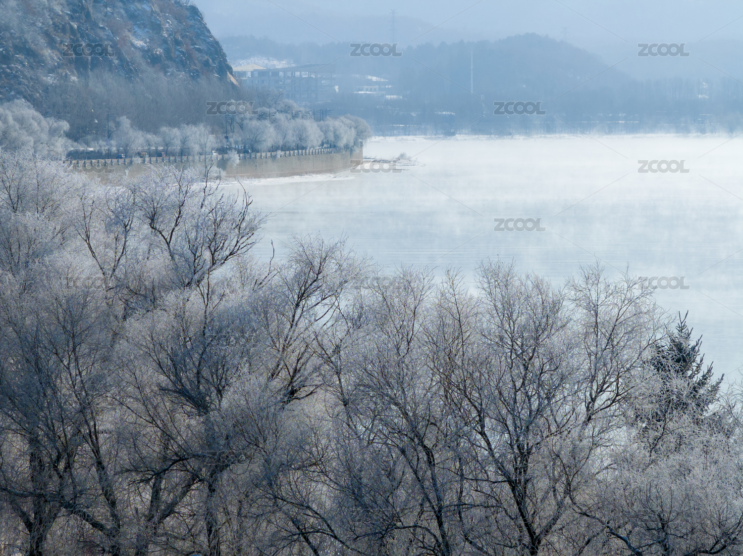 吉林省吉林市雪后松花江上的霧和兩岸霧中的高樓