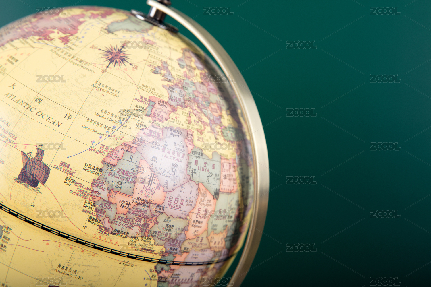 地球儀局部特寫和底部桌子上攤開的地圖及放大鏡