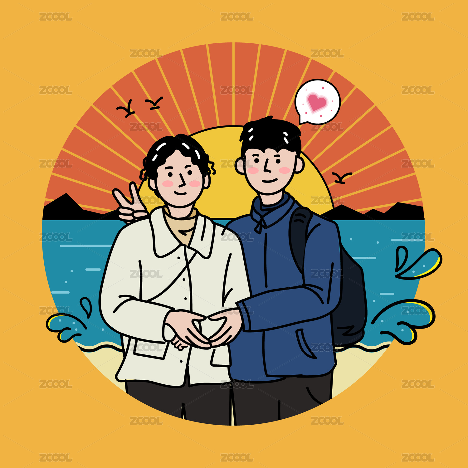 海邊情侶線性插畫