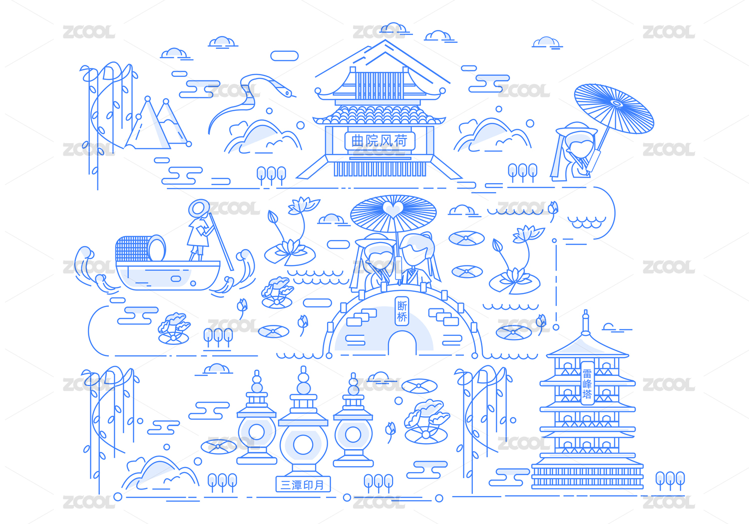 杭州西湖白蛇傳白娘子許仙天堂傘線性插畫