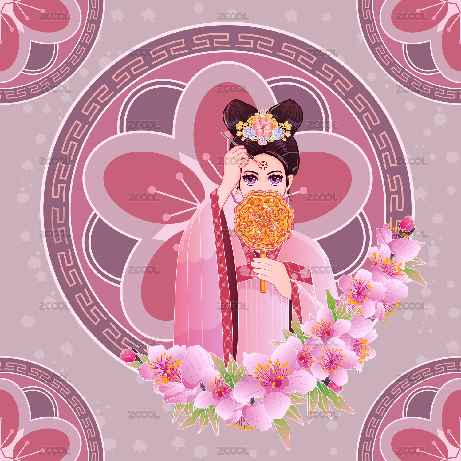 桃花月令花神古風女孩畫花鈿矢量線性插畫