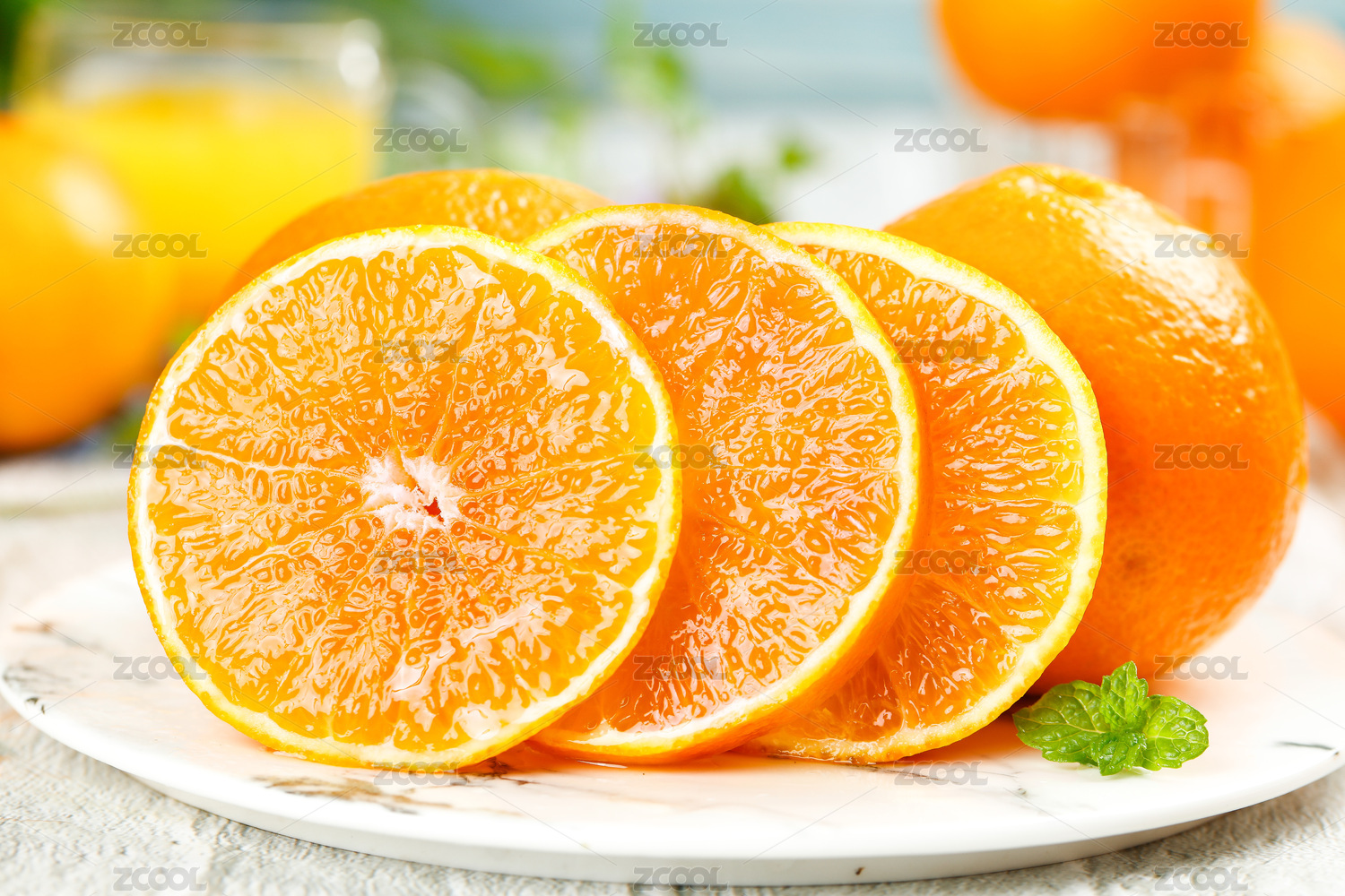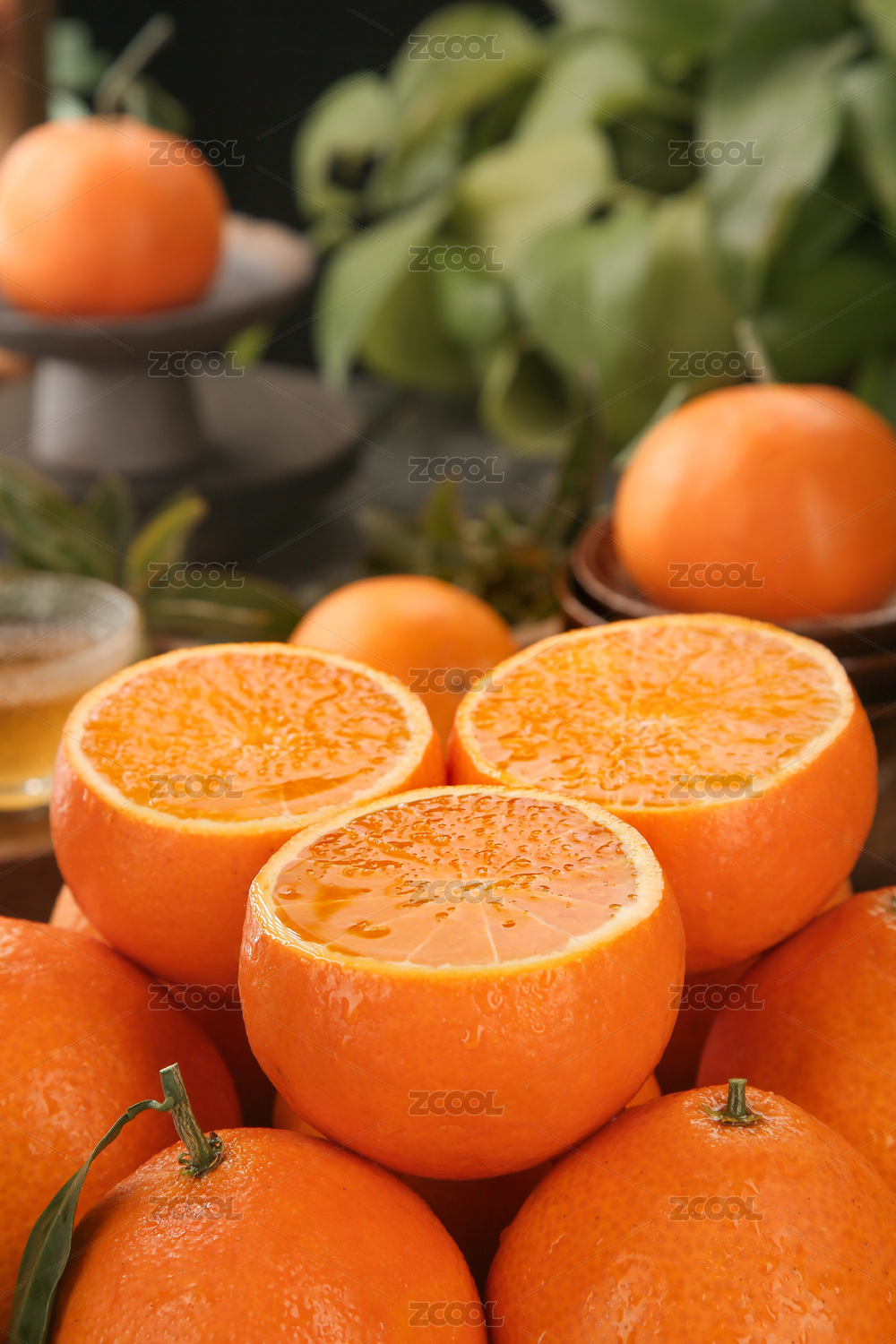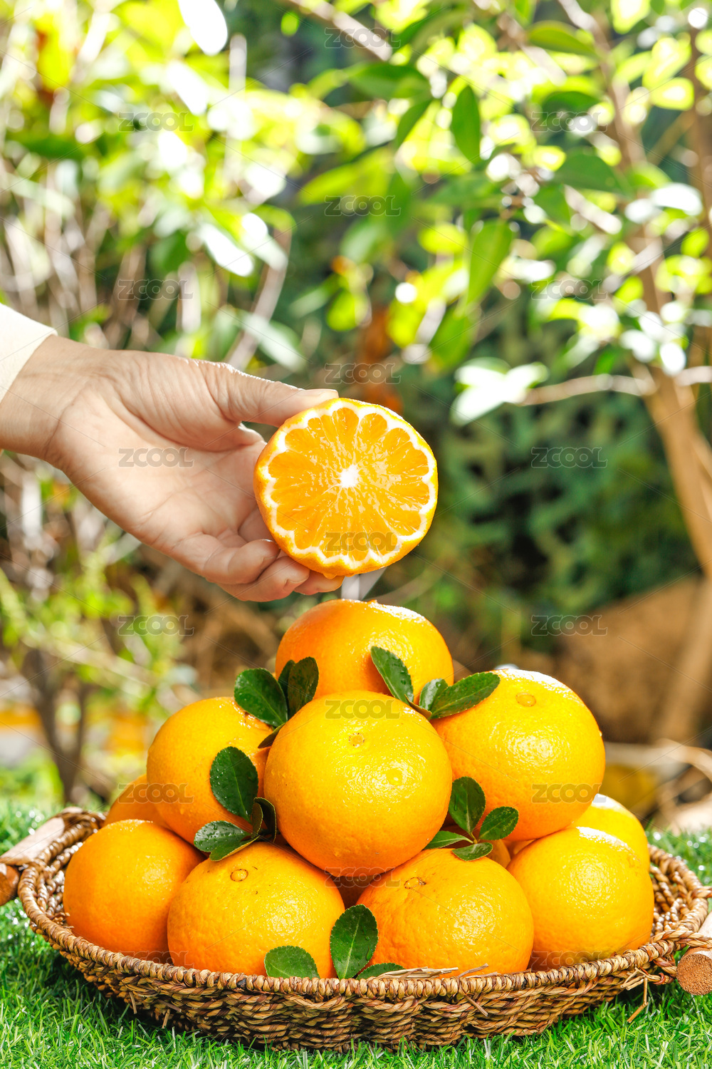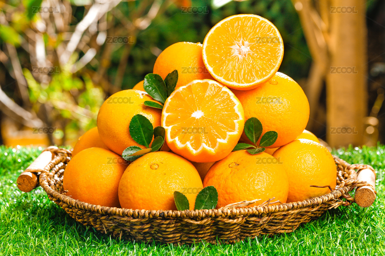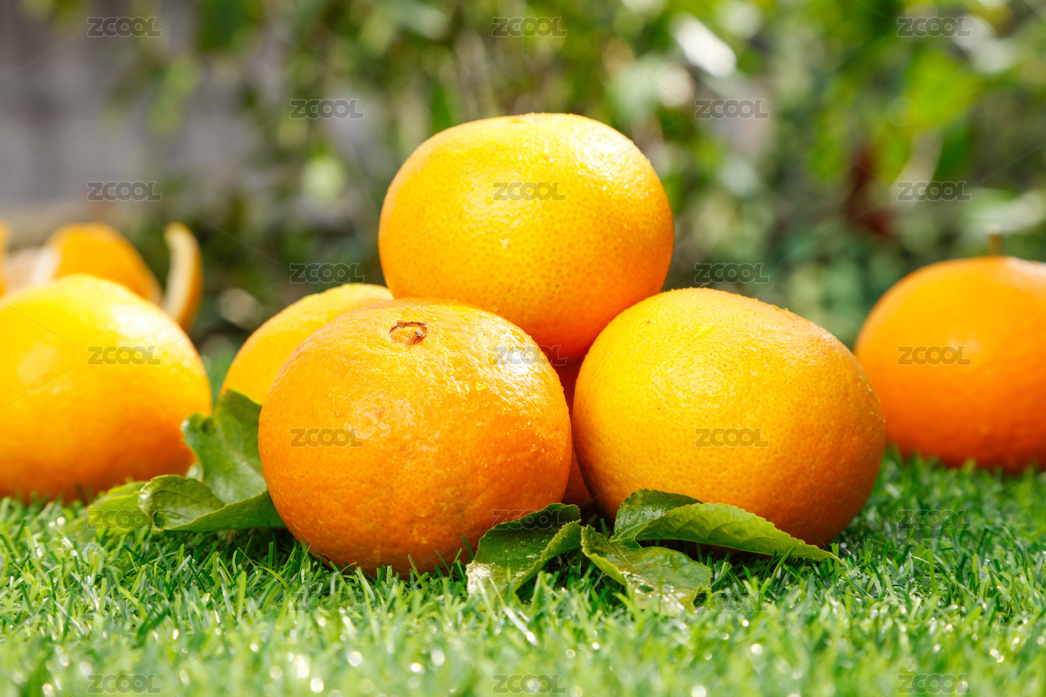 綠色草坪上放著一藍(lán)果凍橙和切面的橙子