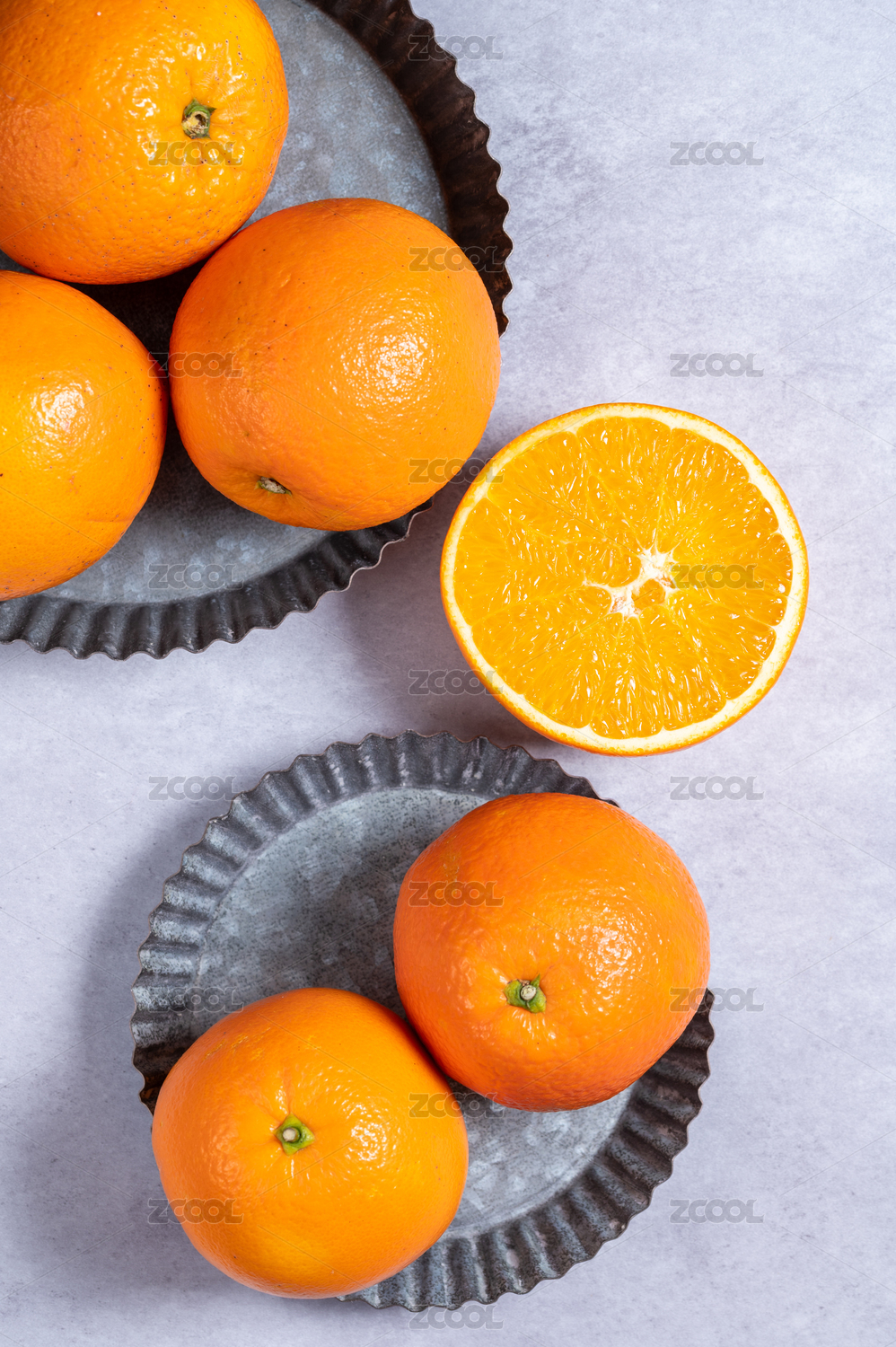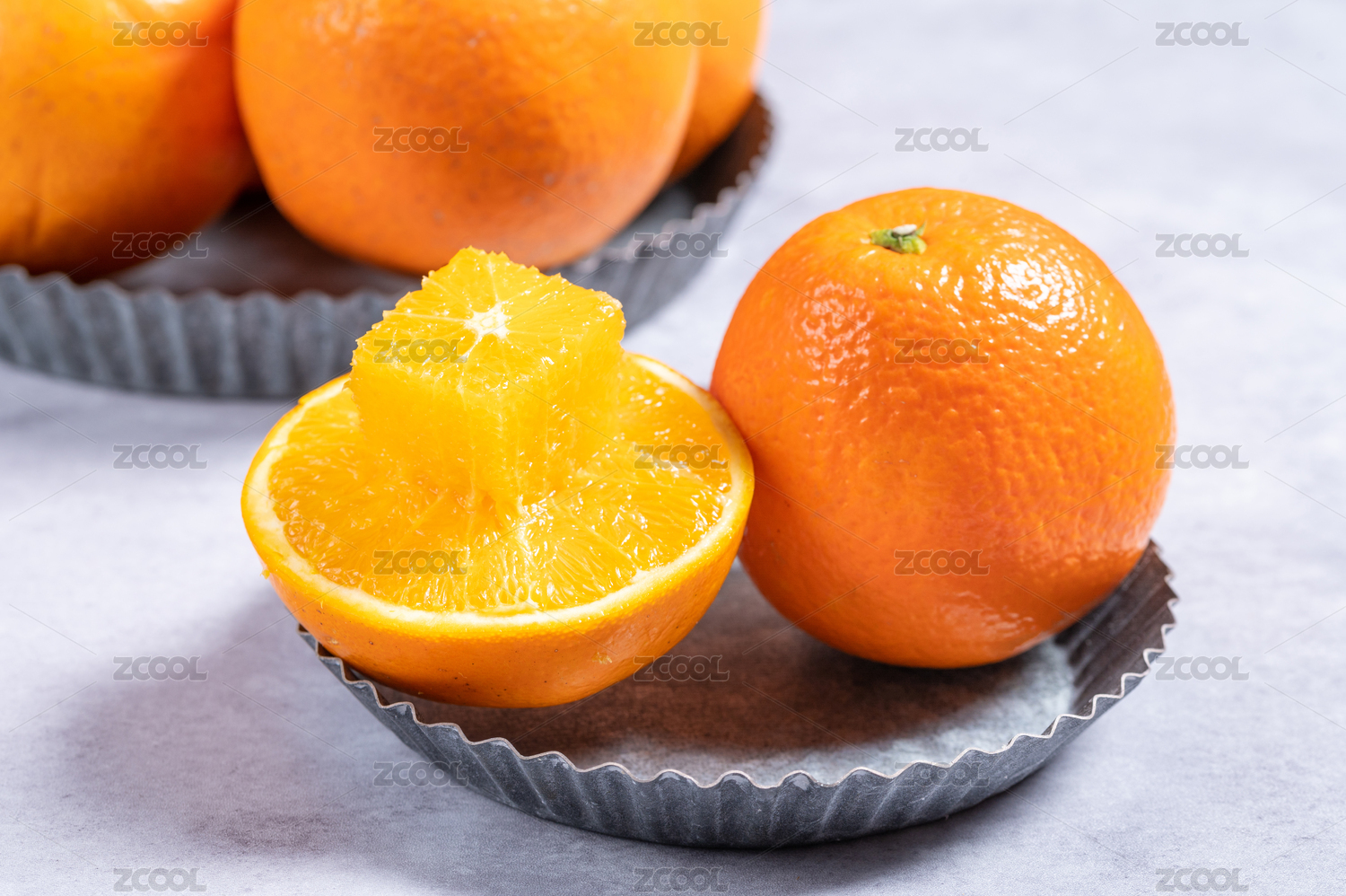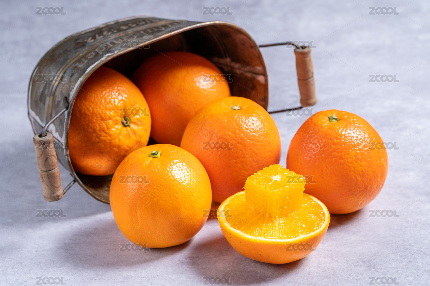 鐵桶中的果凍橙和切開的果肉