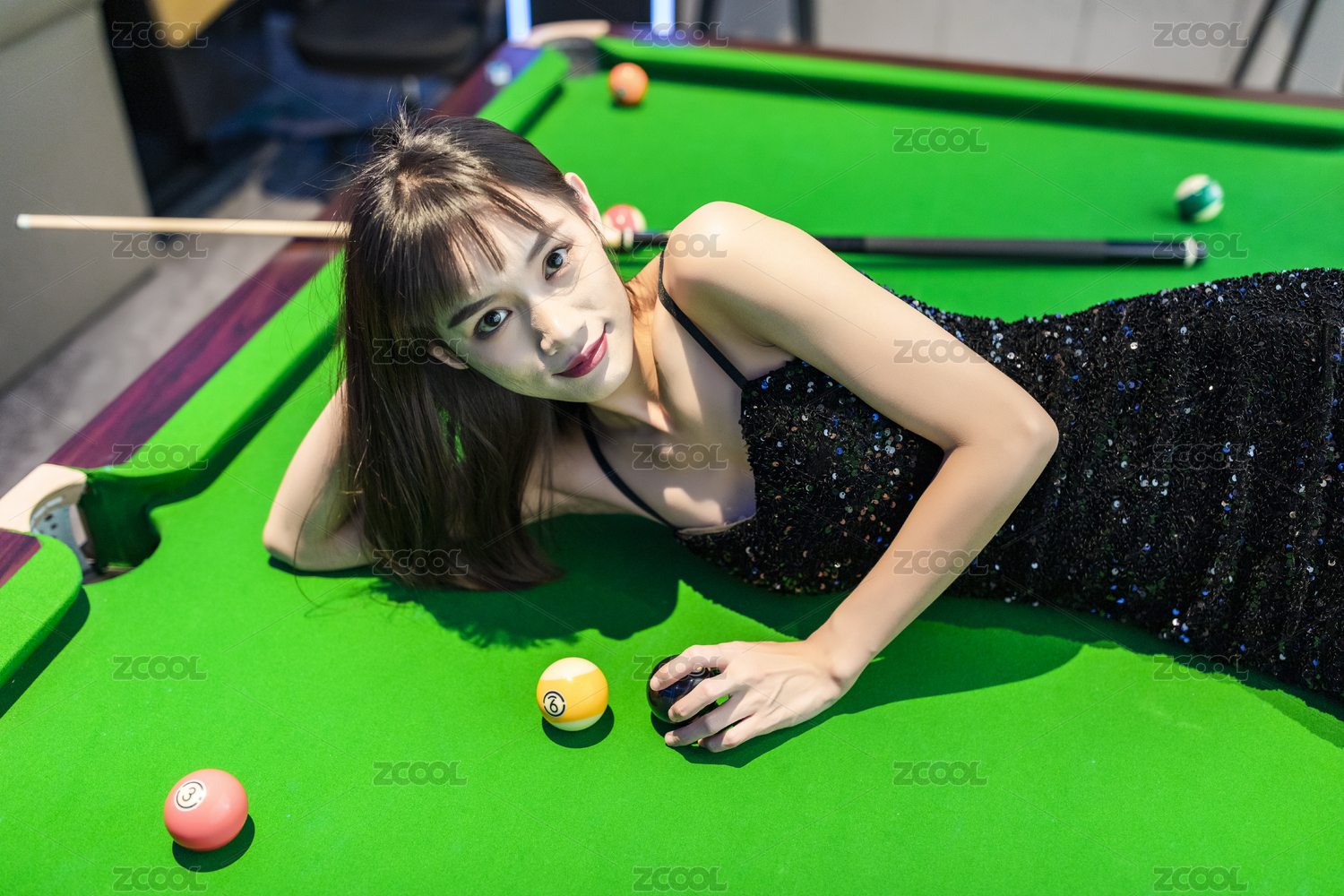 臺球桌前穿著黑色吊帶連衣裙的性感女性