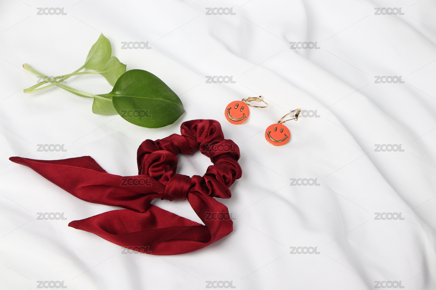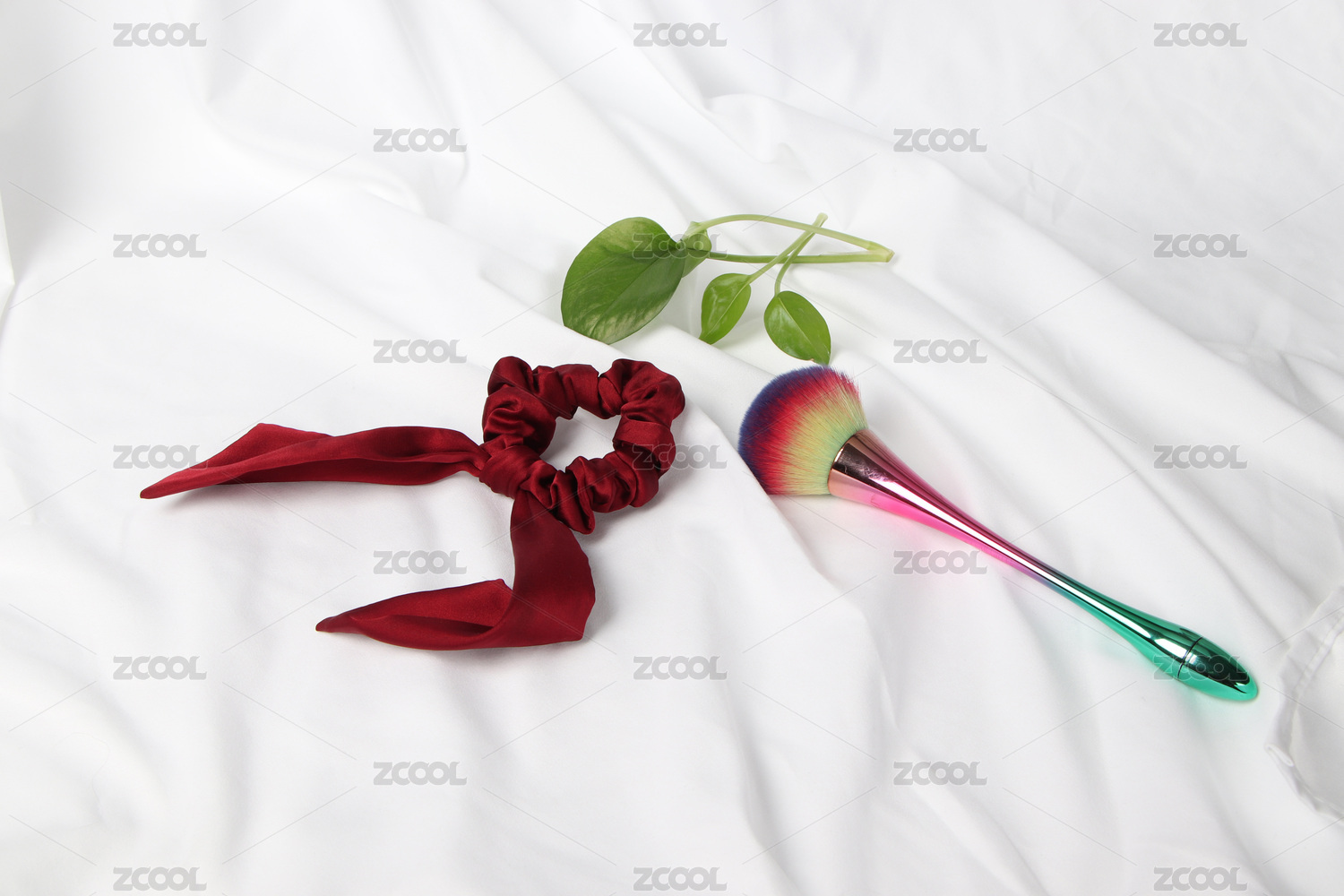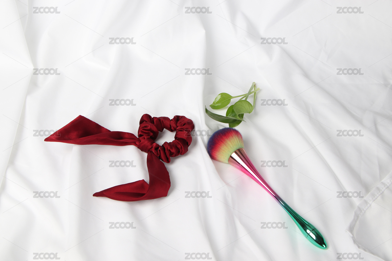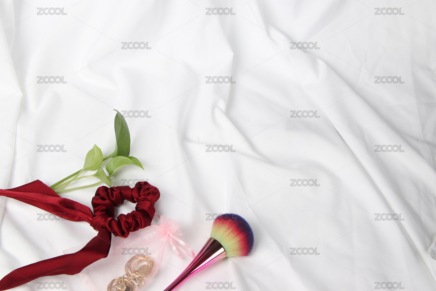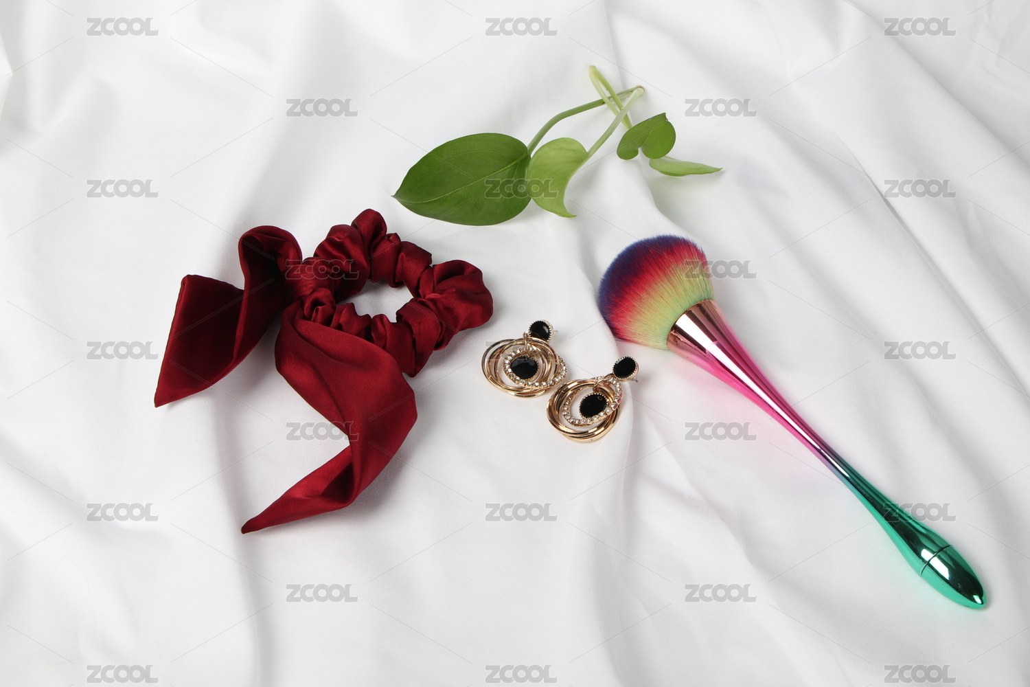 白色背景布上酒紅色發(fā)圈與化妝刷和耳飾