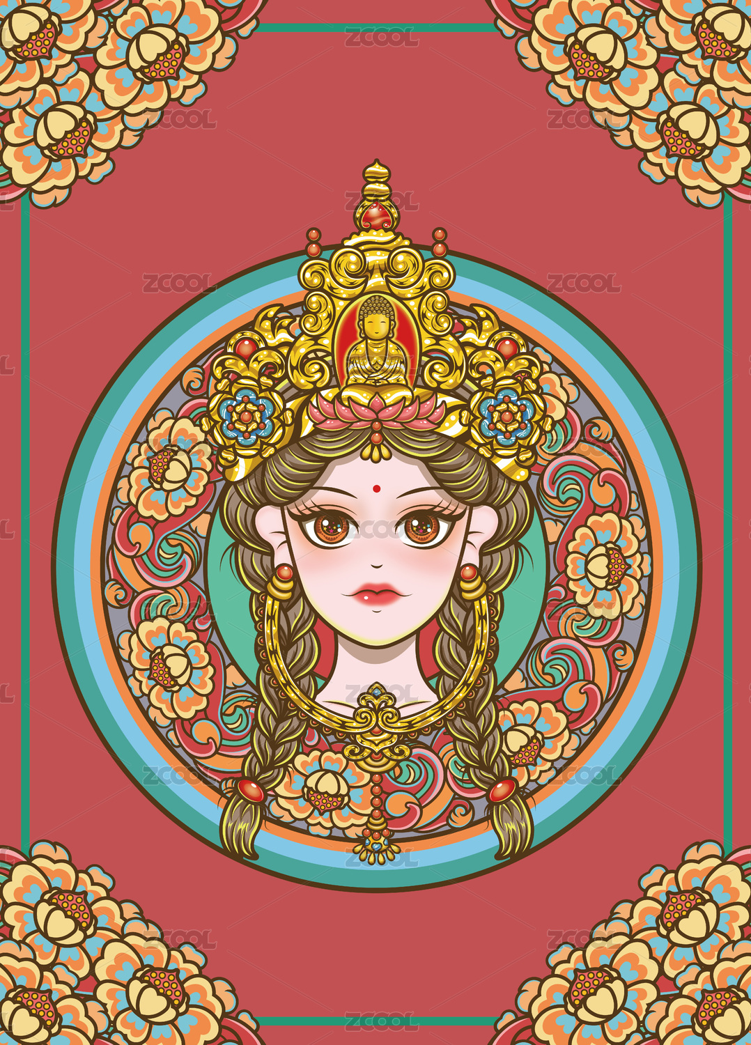 敦煌莫高窟壁畫女孩頭像帶著金頭飾耳飾