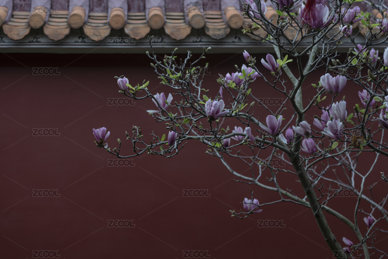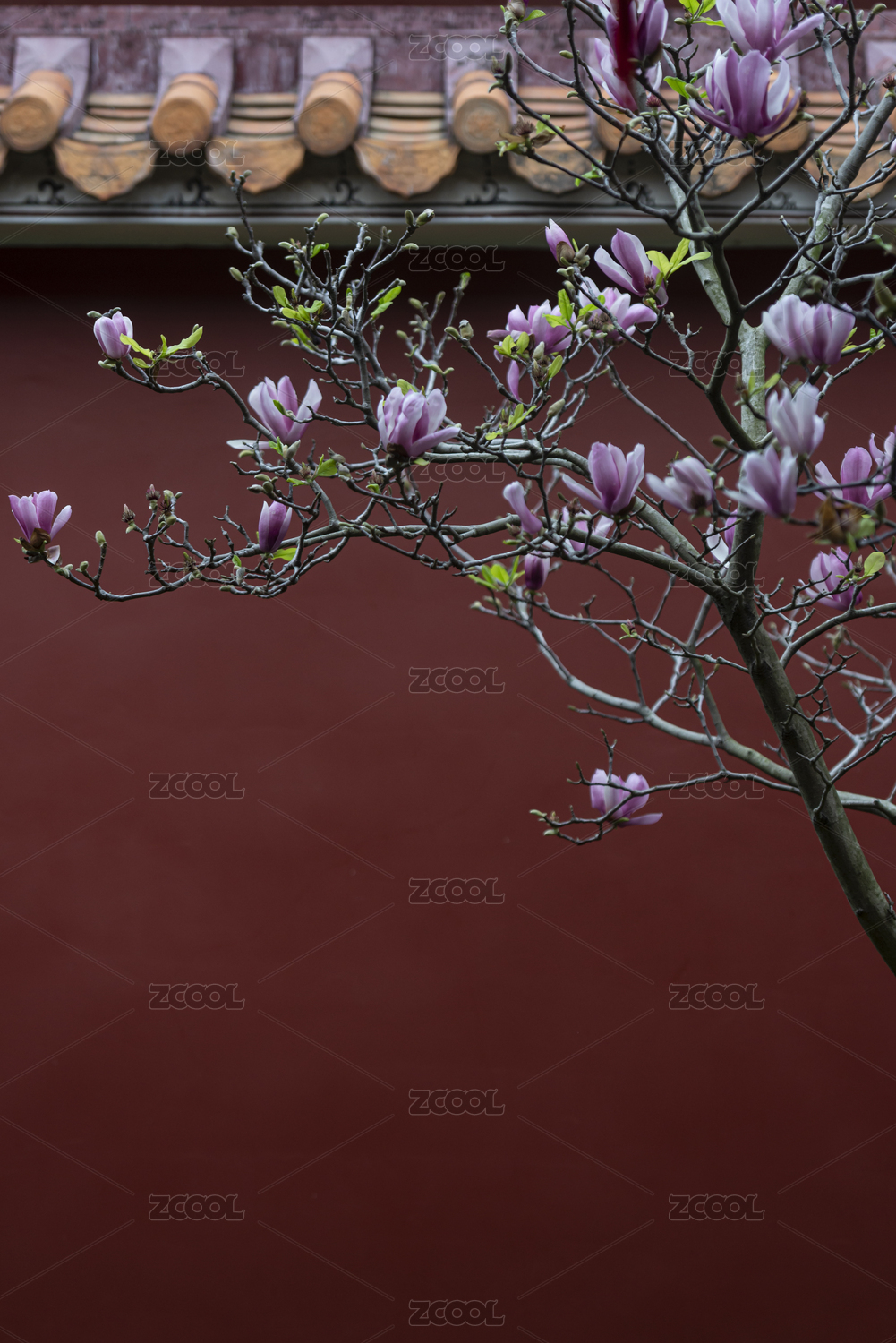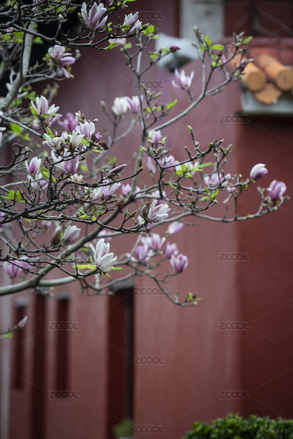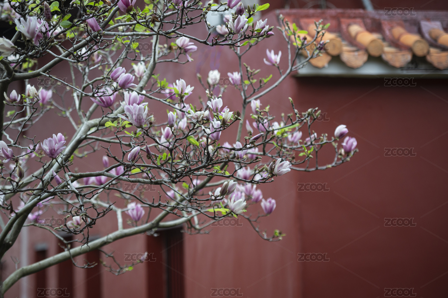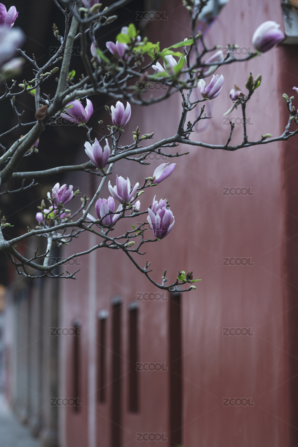朱紅色宮墻邊的粉色玉蘭花,中國廣東潮州